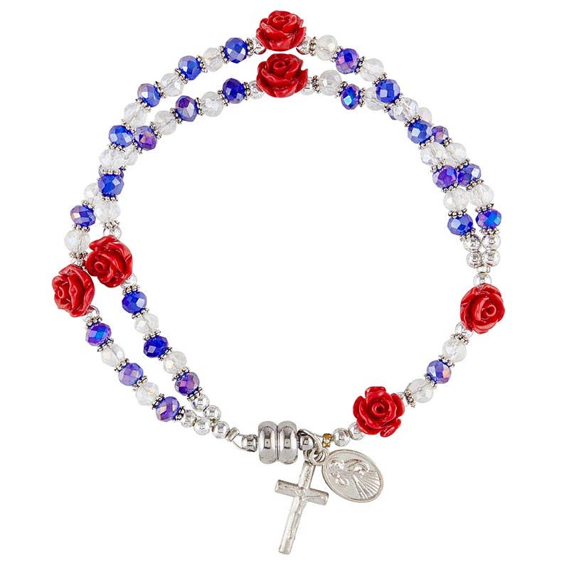 Designed using a silver plated divine mercy medal and simple crucifix dangle, this rose rosary bracelet from creed is truly unique. It features a double strand made of clear, silver plated and blue colored beads anchored by red roses. The bracelet has a magnetic closure for easy putting on and removal.