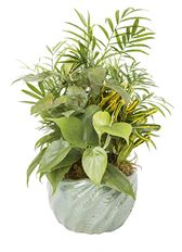 Miniature garden planted in a shallow ceramic container. These gardens typically feature a variety of easy-to-care-for plants, often including green plants like ivy, snake plants, and pothos, and may also incorporate flowering plants like violets or kalanchoe. The ceramic container adds an aesthetic touch, and the overall arrangement is meant to be a long-lasting and visually appealing indoor or outdoor display.