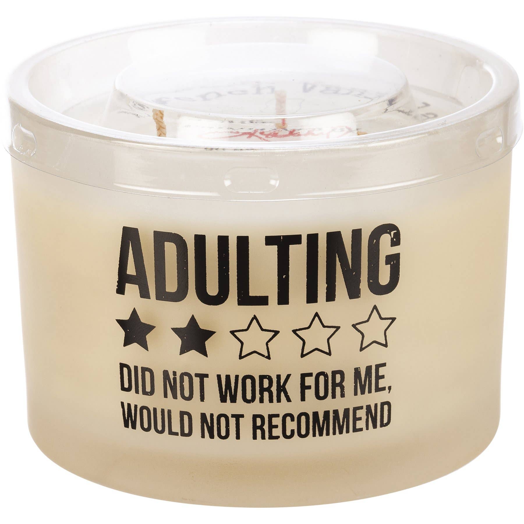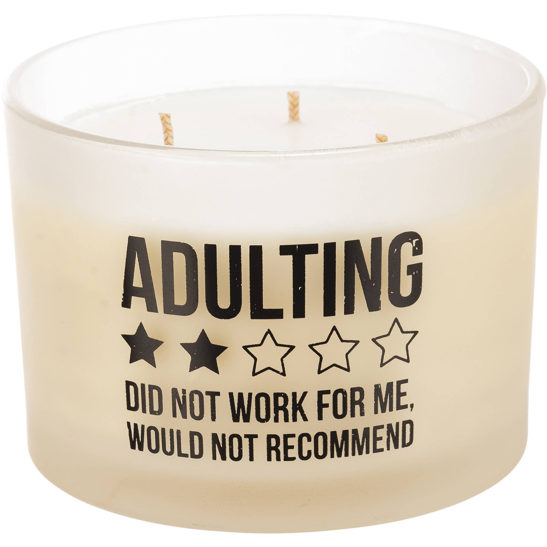 A frosted glass vessel holds this soy-based wax candle from our Box Sign Style Collection featuring a refreshing French Vanilla scent. Box sign style art features "Adulting Did Not Work For Me, Would Not Recommend" sentiment and 2/5 star rating. This Adulting candle is 14 oz. and contains three fabric wicks for a total of 30 hours of burn time. Includes a plastic wax cover for protection and a polished look.