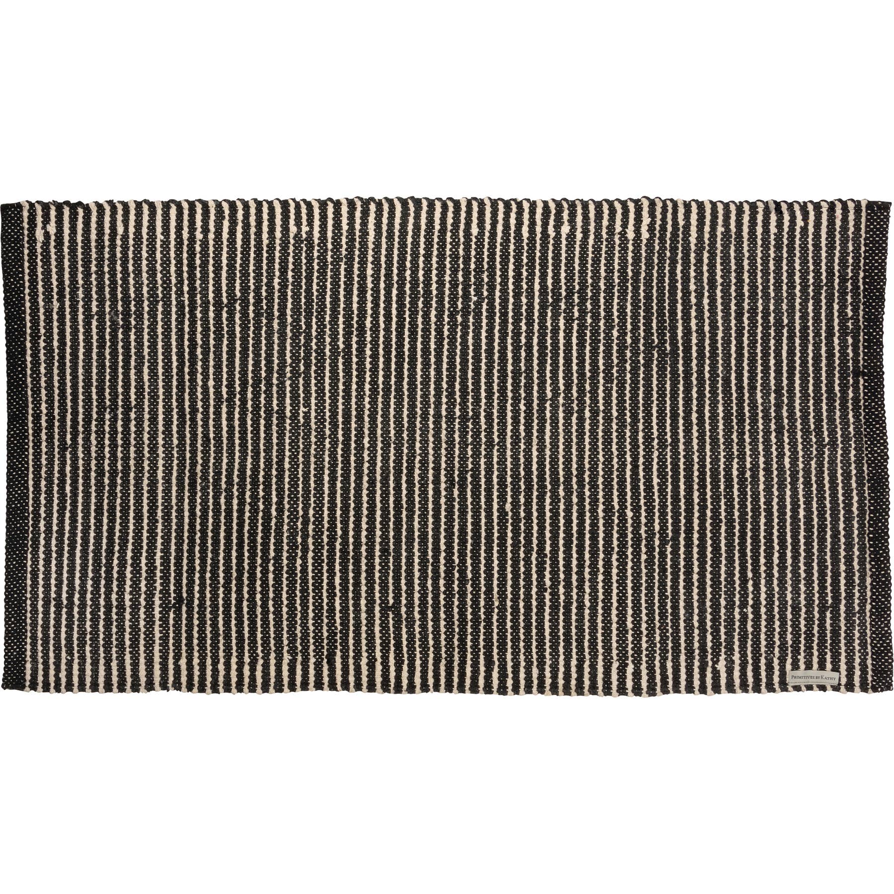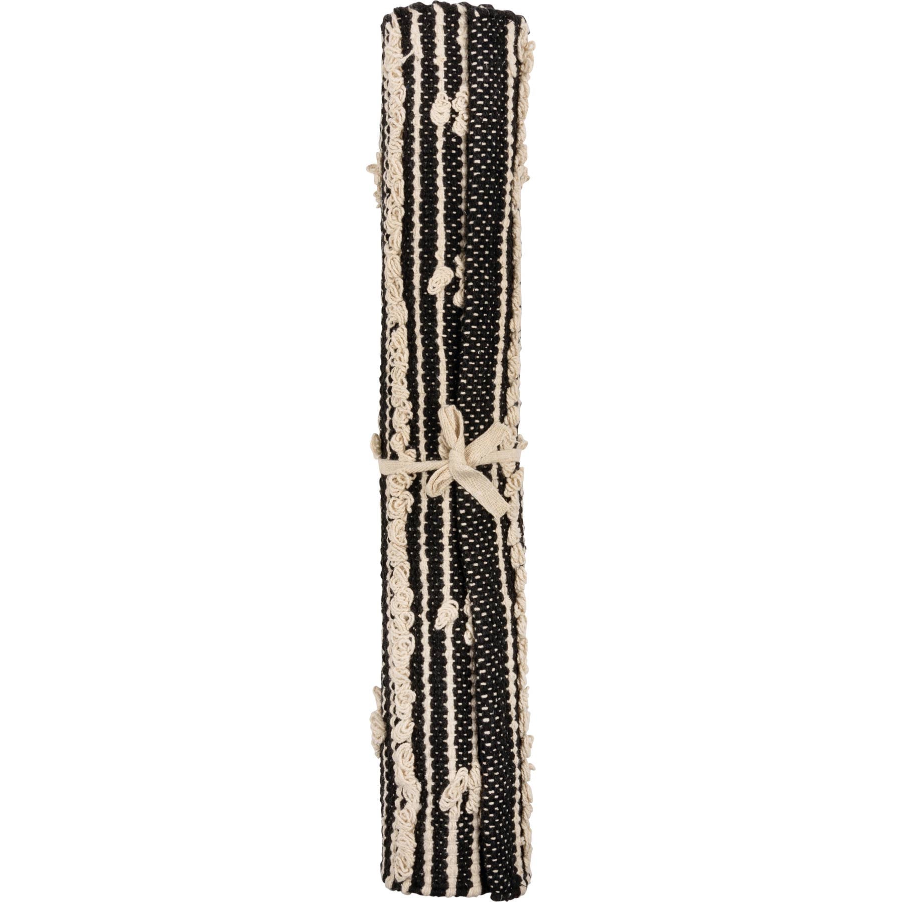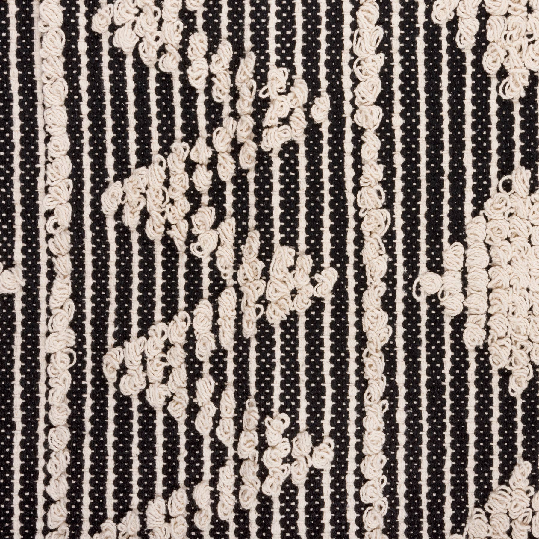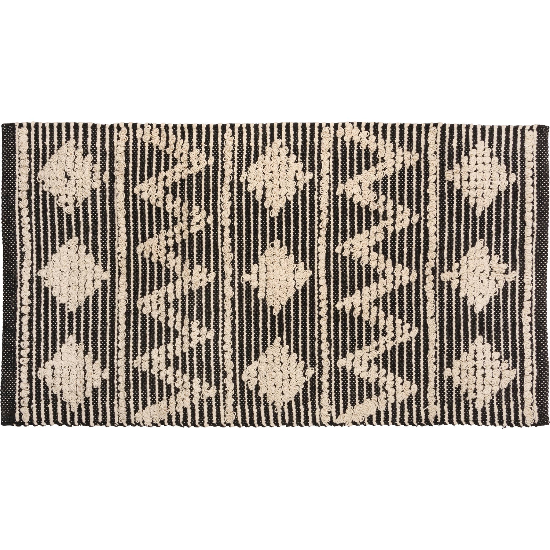 A cotton rug from our Bohemian Collectionfeaturing a bohemian style design with cream diamond designs on a black palette with skid-resistant PVC backing. Rug is neatly rolled with a tag featuring full design. Our Black Diamonds rug is intended for indoor or sheltered outdoor use. Machine-washable.