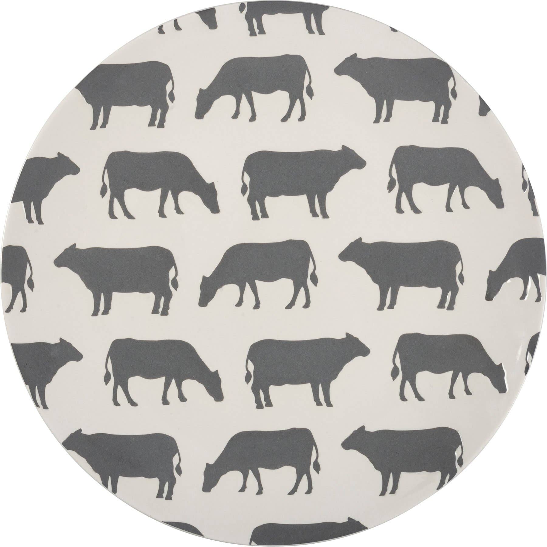 A large stoneware plate from our Tabletop Collection featuring a gray cow design. Microwave, dishwasher, and food safe.
