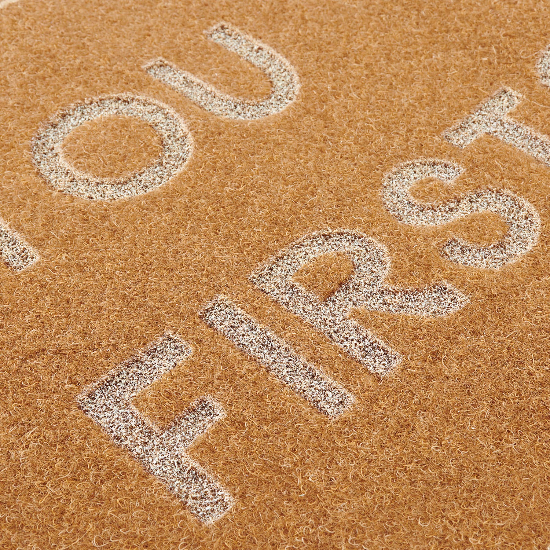 A durable faux coir rug from our Hand Illustrated Collection displaying an engraved sentiment on natural coir background that plays on the idea of "Welcome Mats." Humorous sentiment reads "Did You Call First?" Faux coir offers the benefit of not shedding over time, unlike natural coir rugs, so the integrity of the design and colors will last longer. Rug can be used indoor or outdoor and features skid-resistant backing to help stay in place. Our Did You Call First rug comes packaged neatly rolled with tag displaying full rug design. A fun everyday home accent. Spot cleaning recommended.