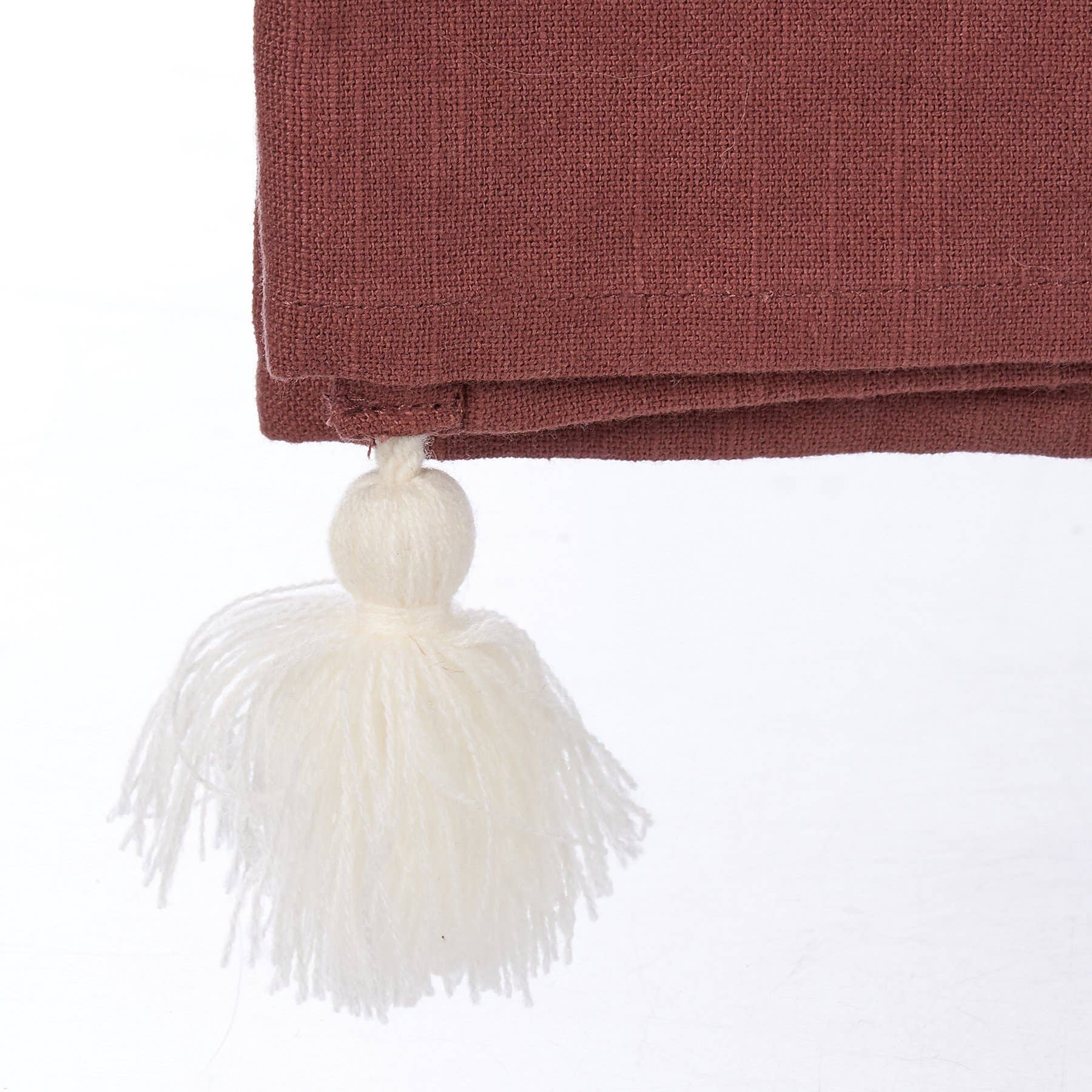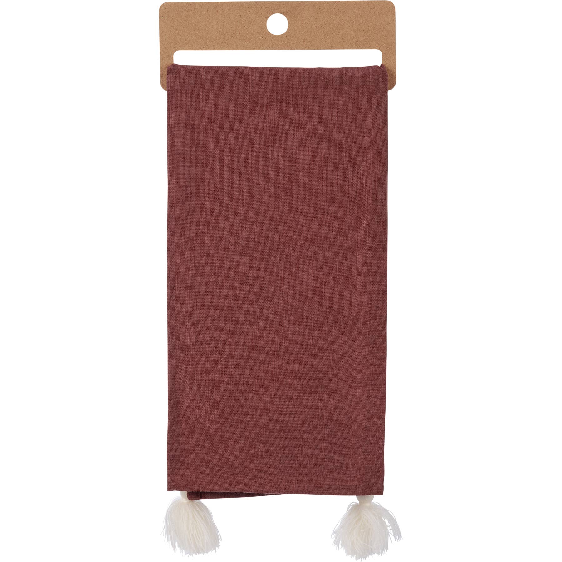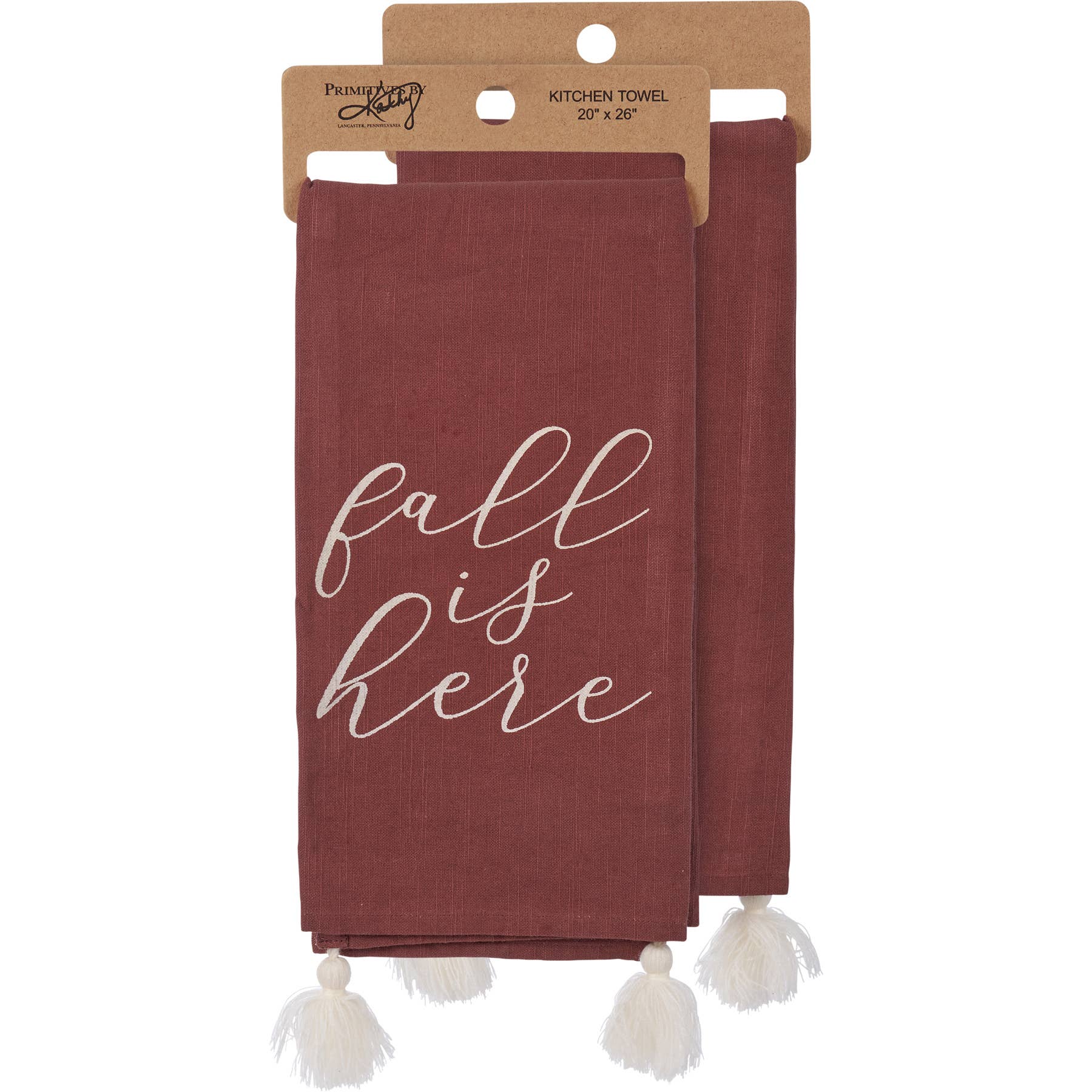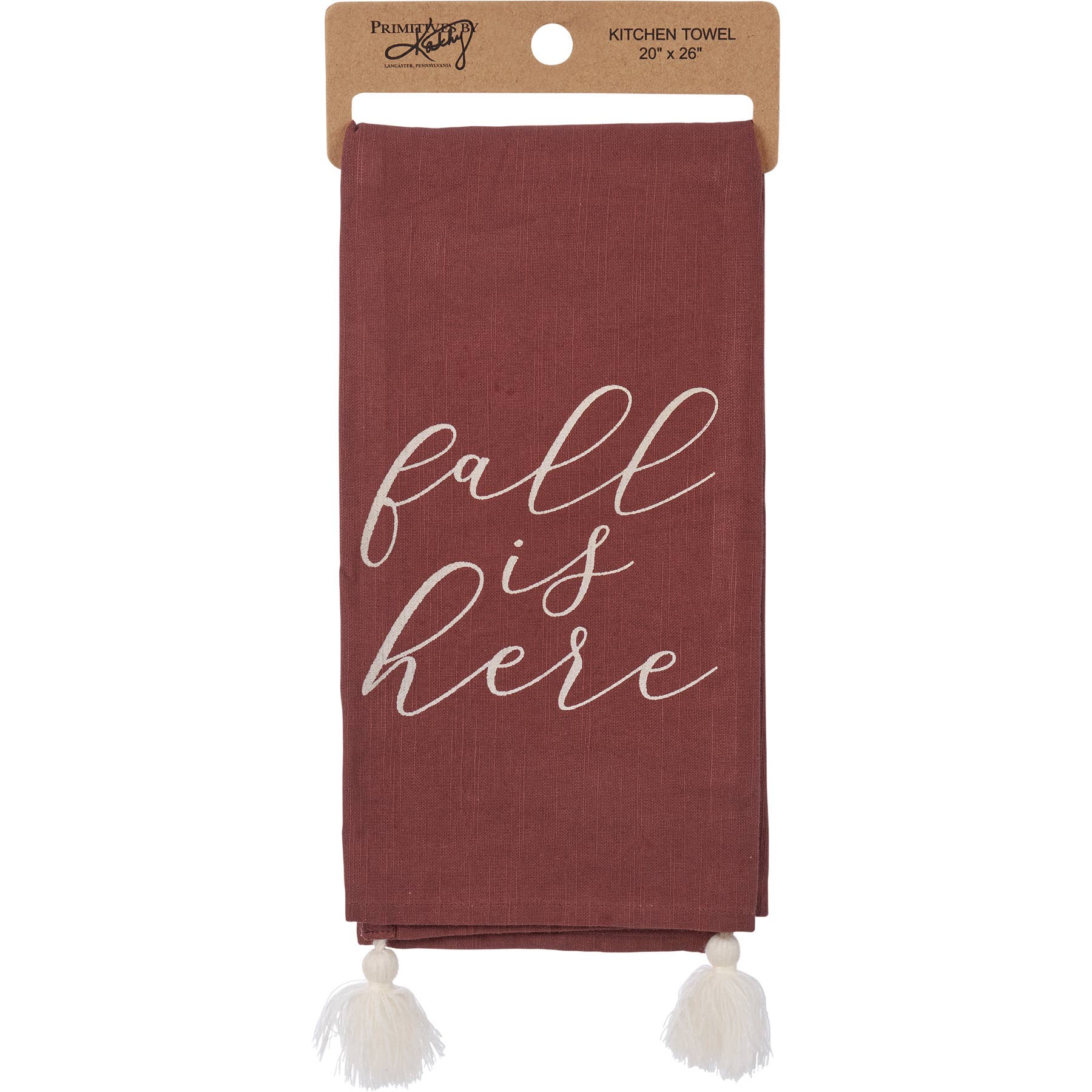 A cotton kitchen towel from our Fall & Harvest Collection displaying hand illustrated design with "Fall Is Here" sentiment on autumn brown color. Towel features 1" cloth tassels on corners for added interest. Packaged on a cardboard hanger with hole to easily hang on rack. The Fall Is Here kitchen towel is machine-washable.