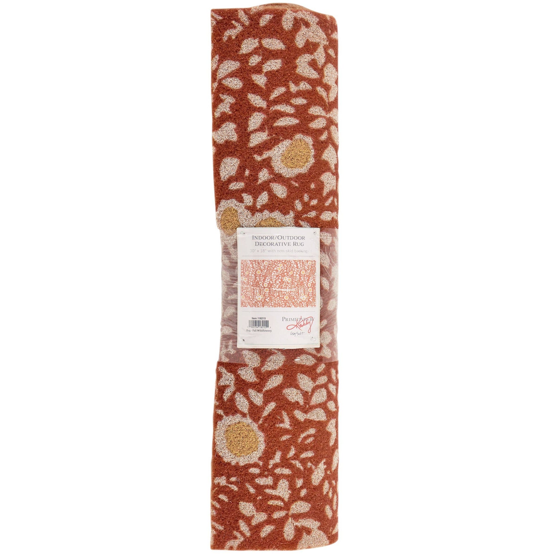A durable faux coir rug from our Fall & Harvest Collection displaying an all-over print of a fall wildflower inspired pattern. Faux coir offers the benefit of not shedding over time, unlike natural coir rugs, so the integrity of the design and colors will last longer. Rug can be used indoor or outdoor and features skid-resistant backing to help stay in place. Spot cleaning recommended. Our Fall Wildflowers rug comes packaged neatly rolled with tag displaying full rug design. A fall-themed seasonal home accent that adds functional style.