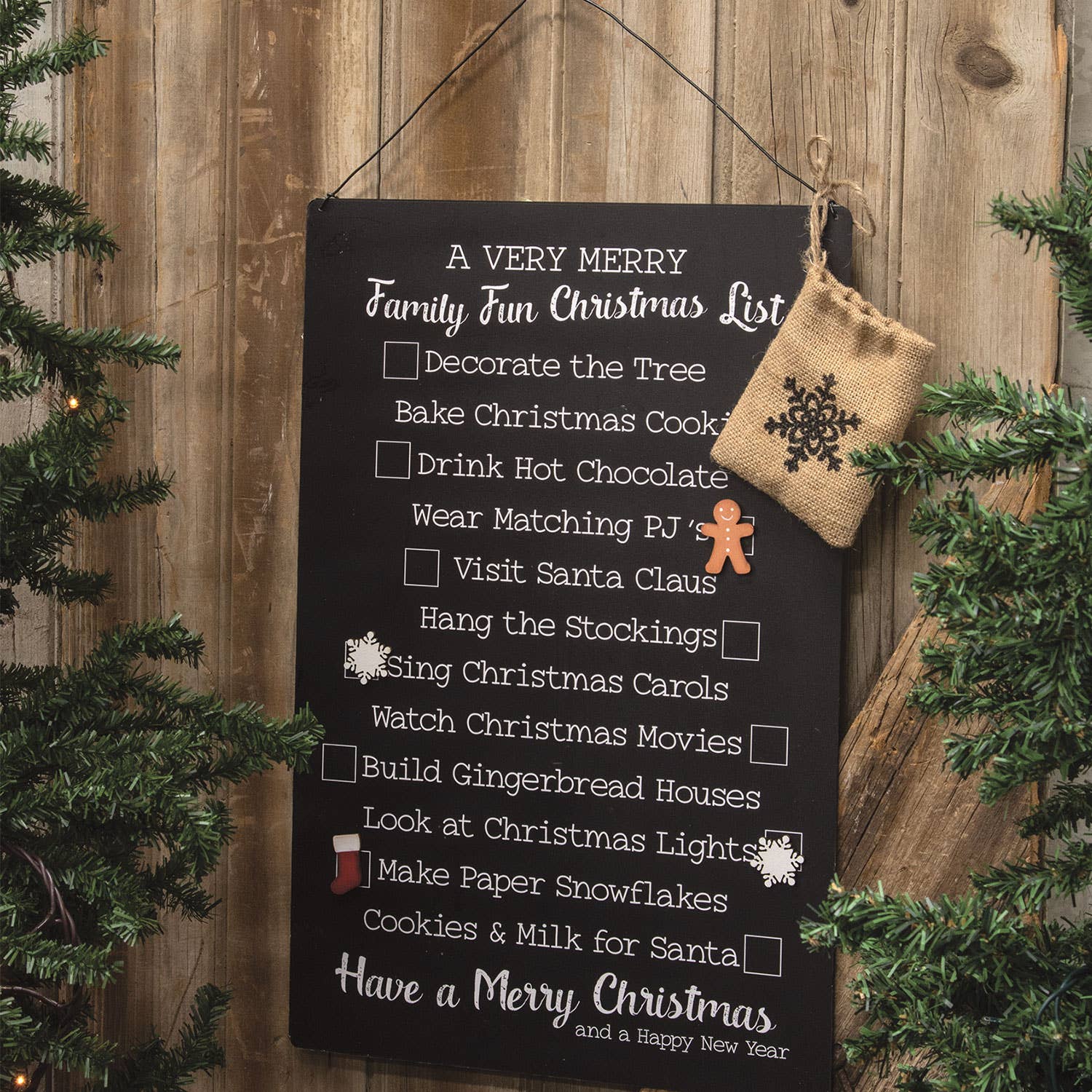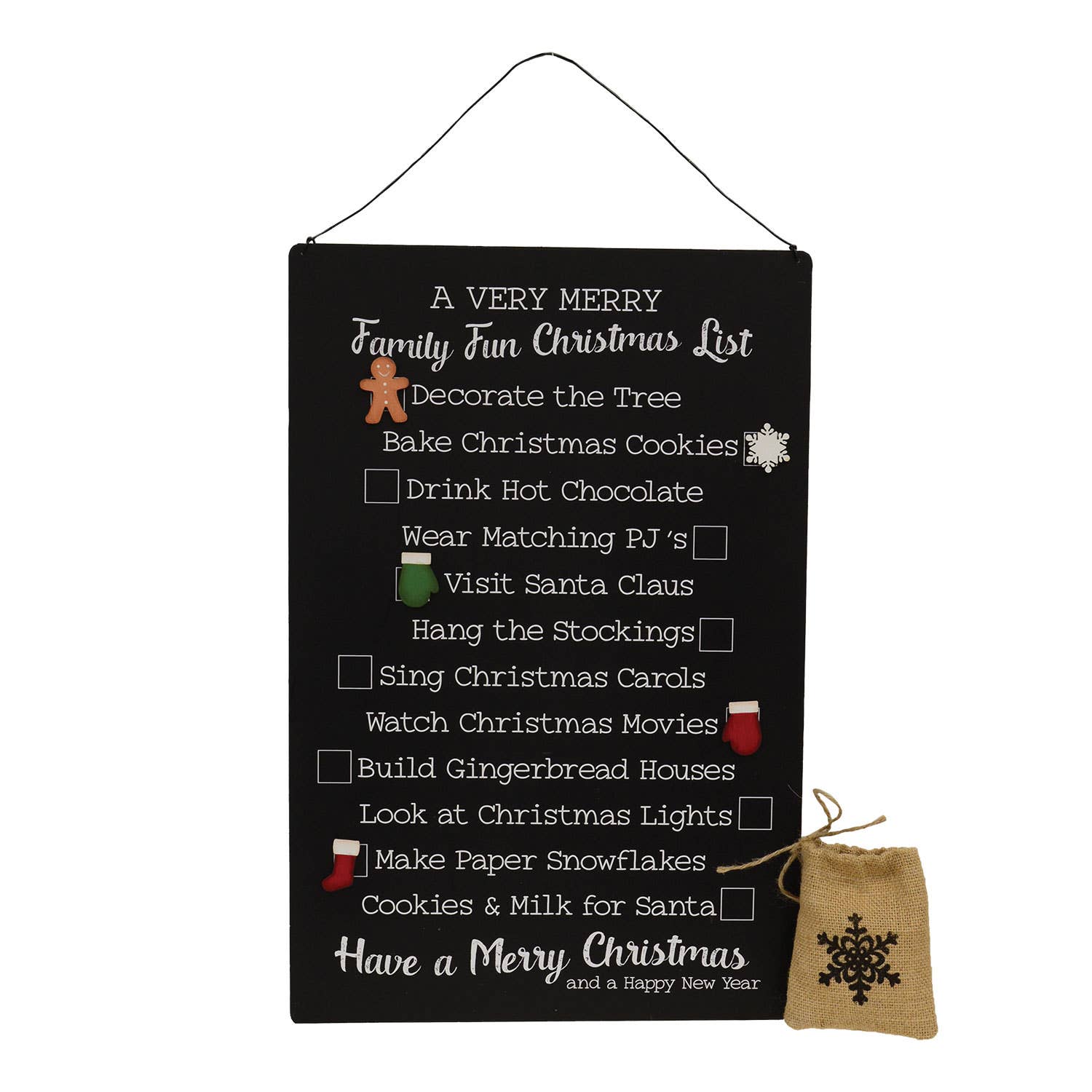Making a holiday list and checking it twice is easier than ever with the Family Fun Christmas Metal Sign with 13 Magnets. The black, metal, chalk-board inspired sign is titled “A Very Merry Family Fun Christmas List” in white lettering and script. Twelve family Christmas traditions, such as “Decorate the Tree,” “Wear Matching PJs,” “Build Gingerbread Houses,” and “Sing Christmas Carols” are listed below, each with a check box. Use the included magnets to mark the activities of the day. The magnets are in the shapes of Christmas classics like a gingerbread man, a stocking and snowflakes and come in a rustic drawstring burlap bag stamped with a black snowflake. Easily hang using the attached wire hanger. The sign measures 18” high by 12” wide.
