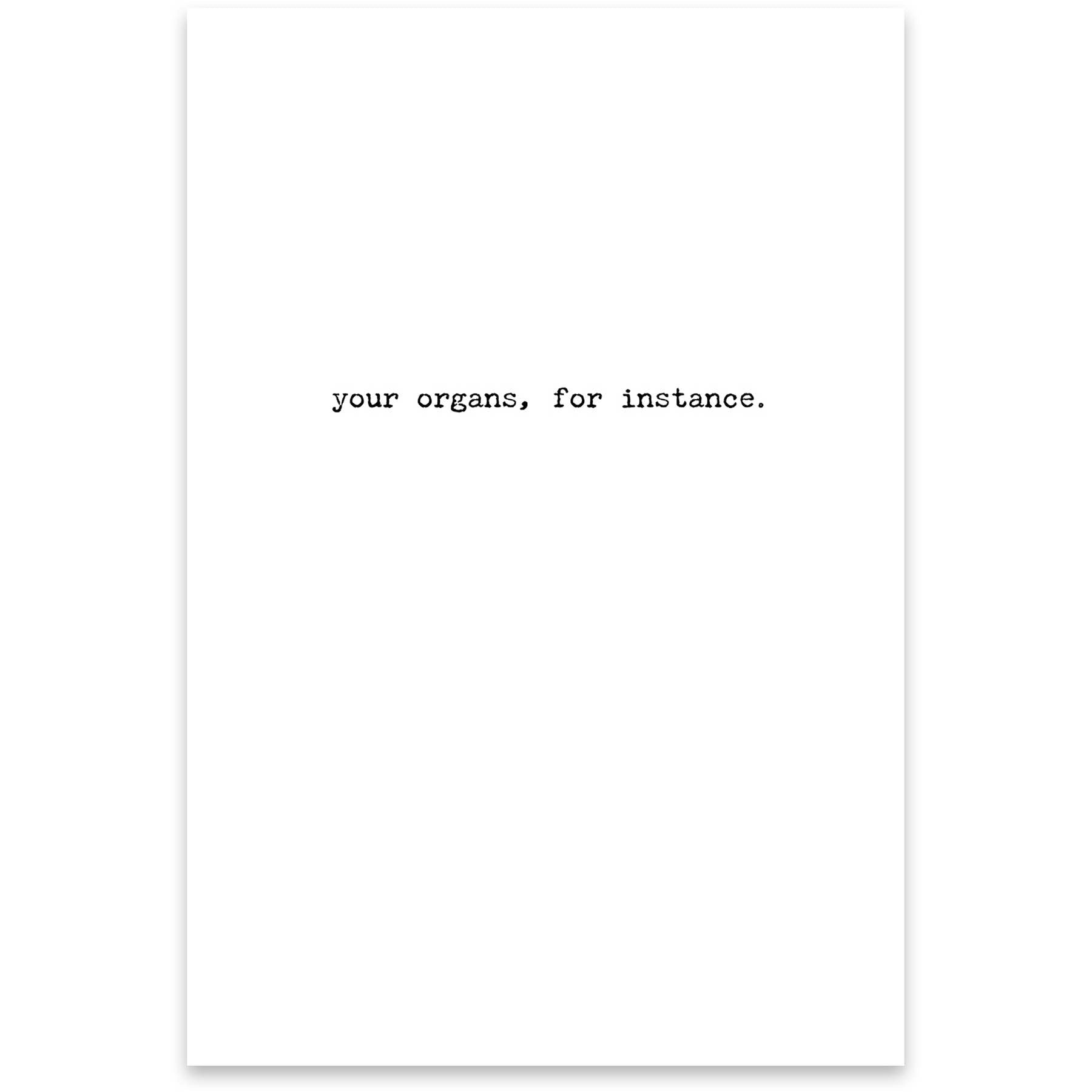 A humorous greeting card from our Trash Talk by Annie Collection features a vintage photograph with "You May Be Getting Older But You Still Have A Lot To Offer Society…" sentiment on the front, and "Your Organs, For Instance." sentiment on the inside. Our For Instance greeting card is made in the USA.