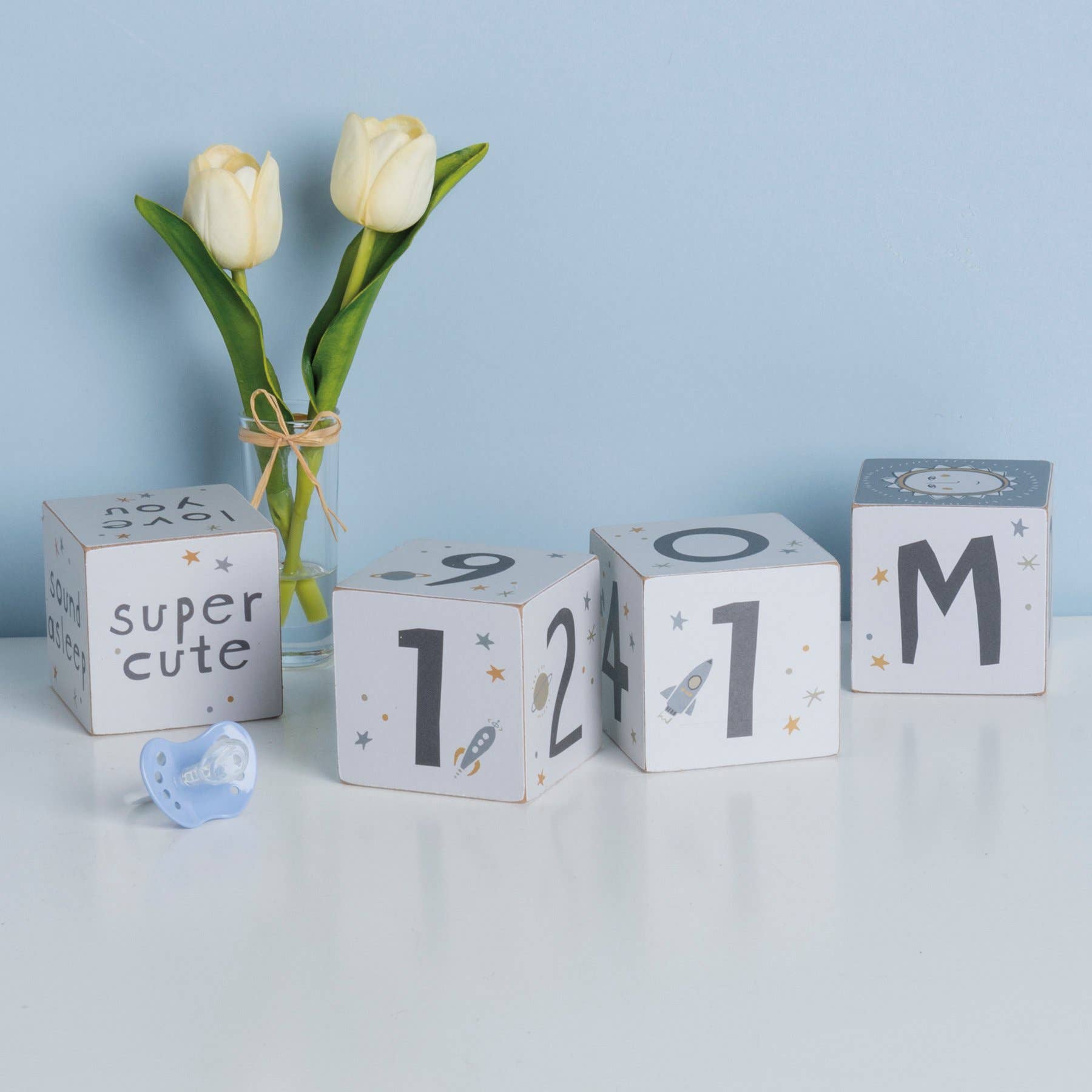 A set of four wooden milestone blocks in a galaxy theme. Contains two numbered blocks, one timeframe block, and one sentiment block with varying designs. A part of our exclusive Happy + Bright Collection. Created with non-toxic paint. Countdown blocks are intended to count down from 32 days. Block One: 0, 1, 2, 3, 4, 5; Block Two: 0, 1, 2, 7, 8, 9/6.