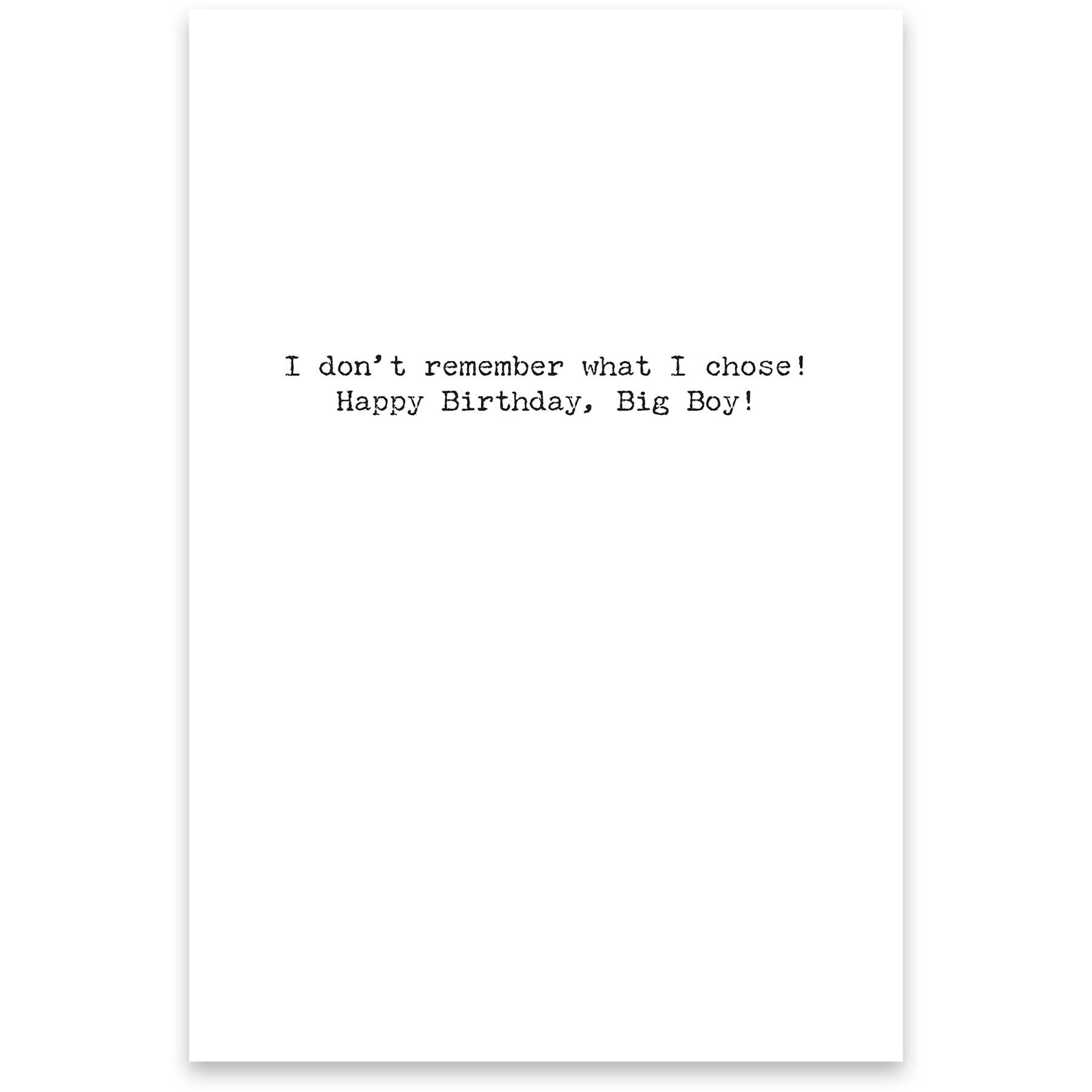 A humorous greeting card lending a vintage photograph to coordinate with its outside "When I Was Born, I Was Given A Choice… A Big Dick Or A Good Memory..." sentiment and inside "I Don't Remember What I Chose! Happy Birthday, Big Boy!" sentiment. Made in the USA.