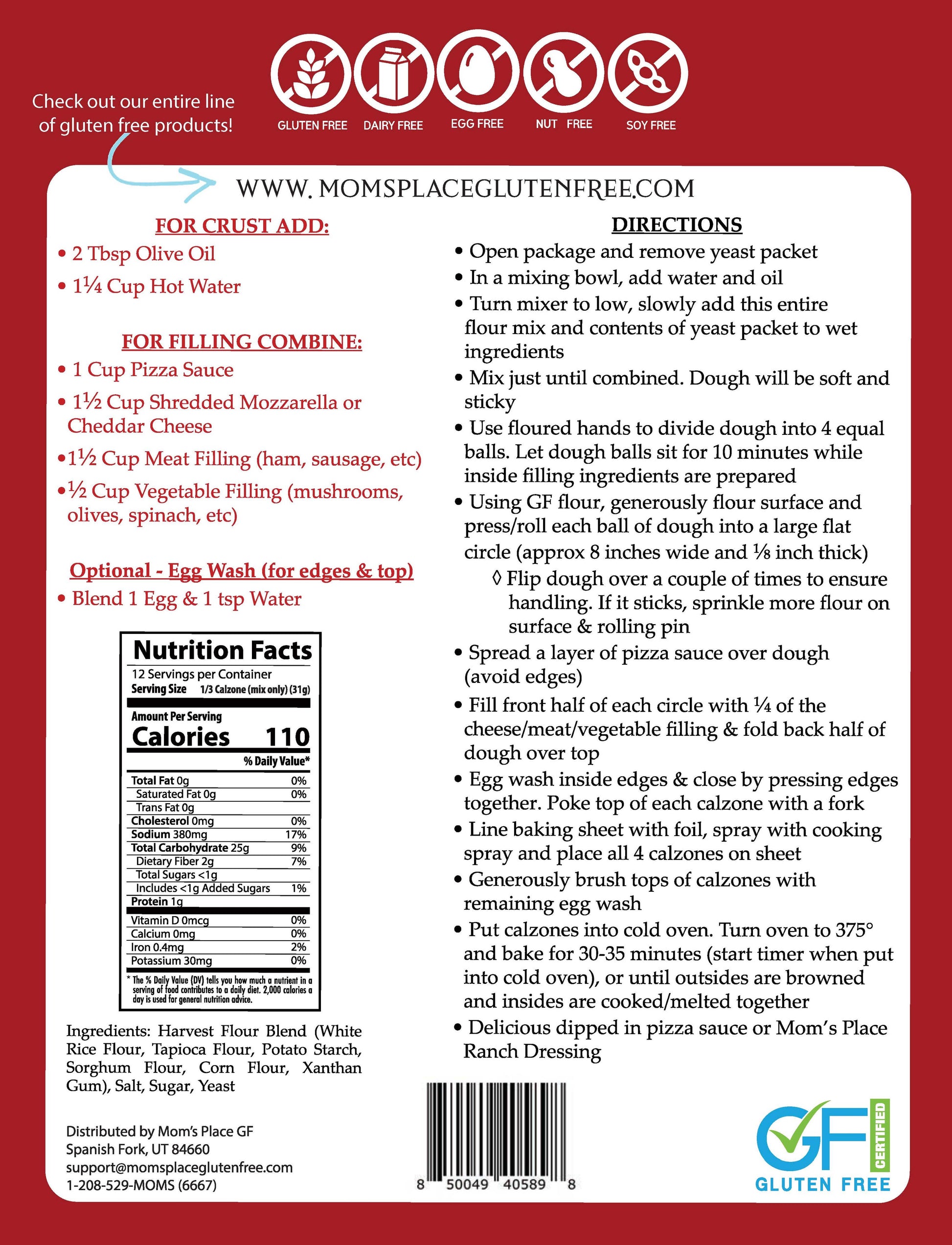 Mom's Place Gluten-Free Italian Calzone & Pizza Pocket Mix makes it easy to create delicious, stuffed calzones or pizza pockets filled with your choice of classic pizza toppings. Perfect for bakeries, foodservice, or retail, this versatile mix delivers authentic Italian flavor with the convenience your operation needs.