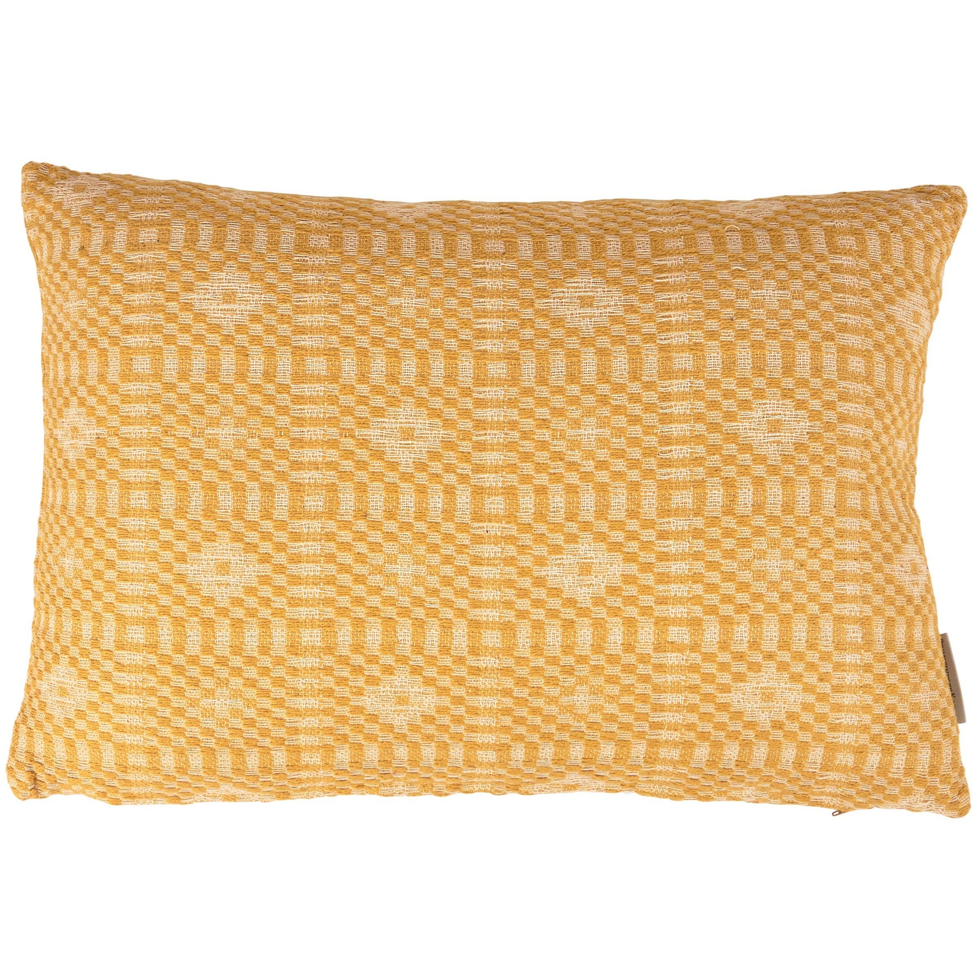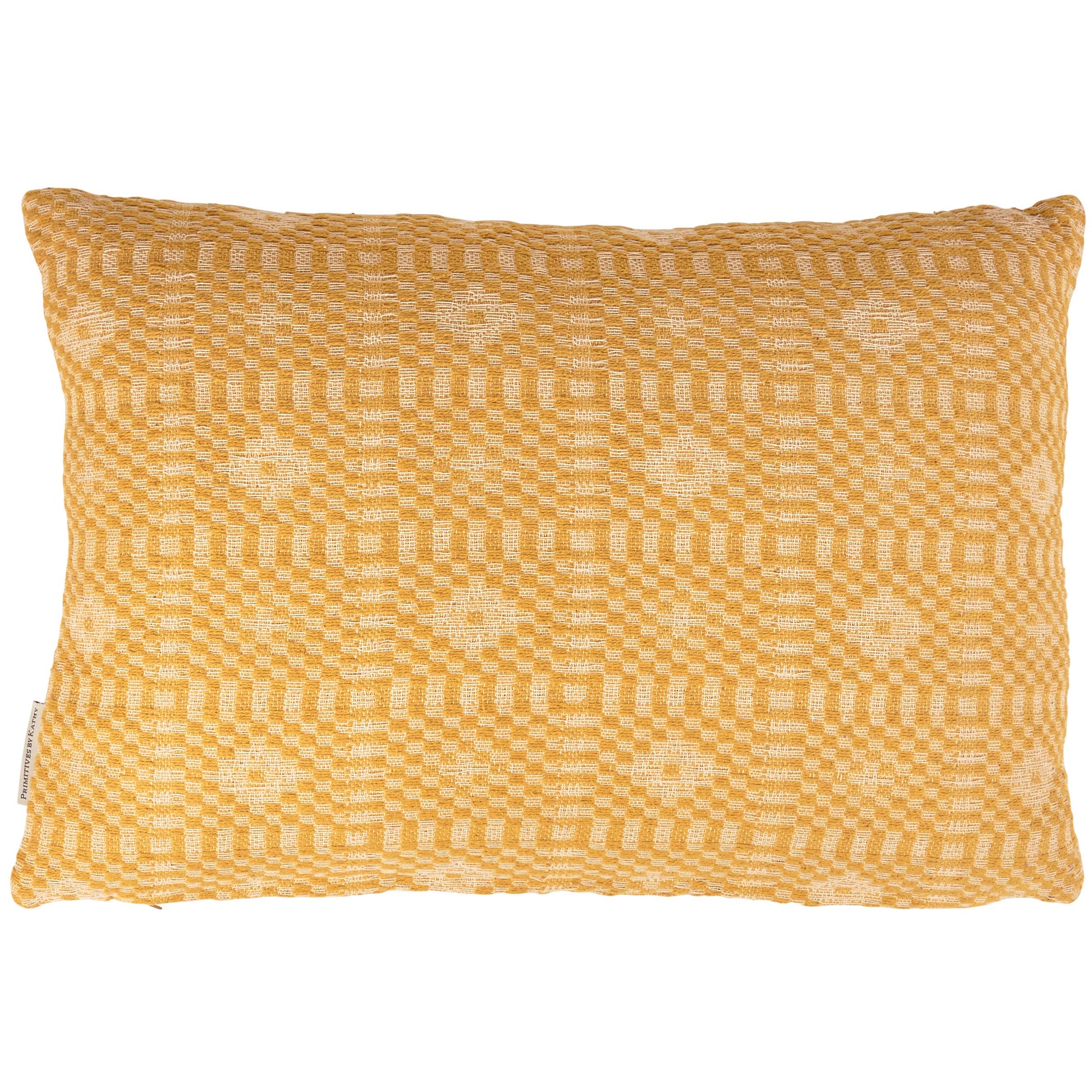 A decorative cotton throw pillow from our Primitive Collection displaying a double-sided design of diamond patterns in gold and cream. Our Gold Diamonds pillow includes a zipper to easily remove and clean machine-washable pillow cover. Pillow contains polyester filling and is shipped vacuum-sealed for protection and storage. A rustic everyday home accent that adds style to any room.