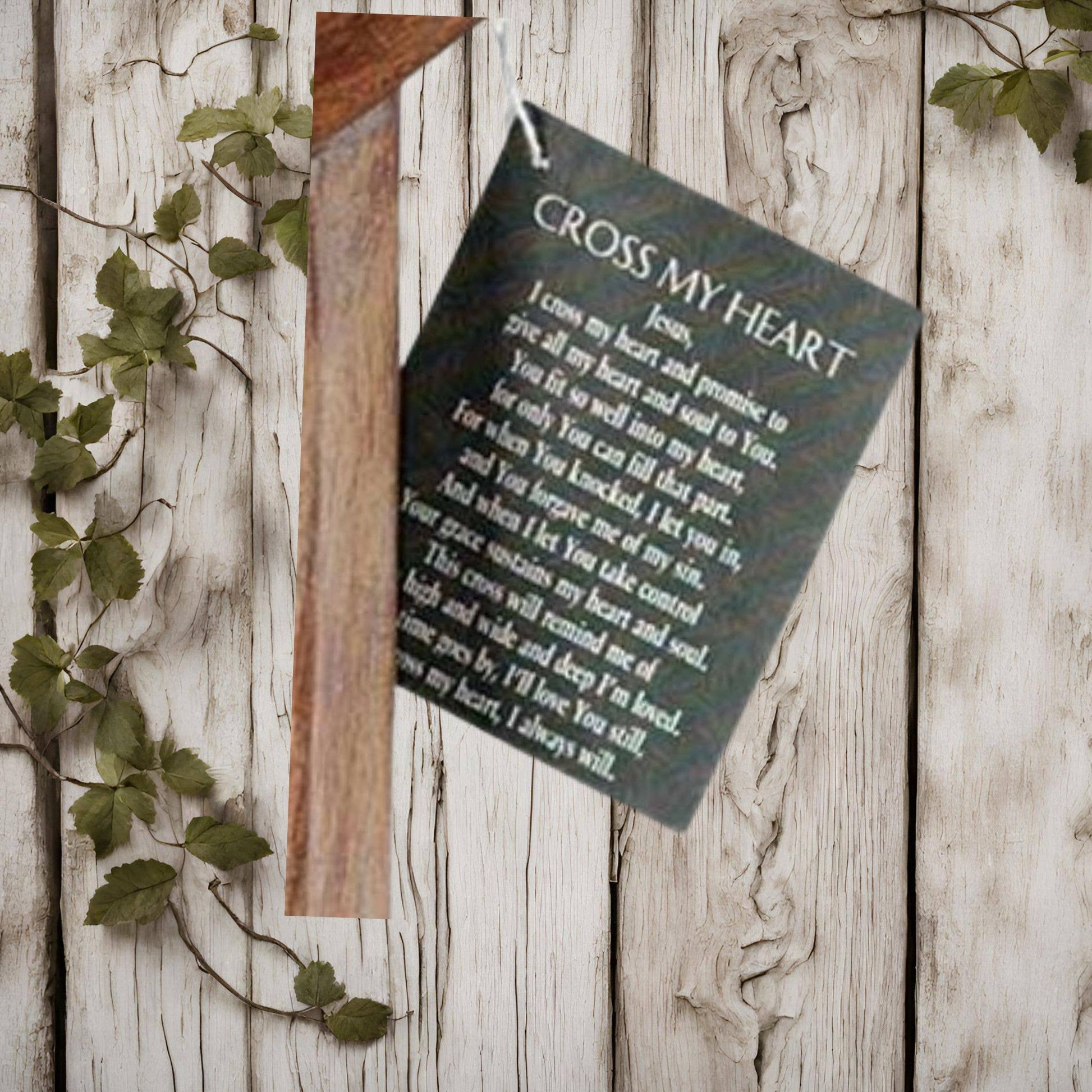 Lovely wall cross, with unique heart drape, has the look of gently whitewashed wood. Comes with a tag that has the poem Cross My Heart. Makes an ideal Christian gift for many occasions. Cross is just under 11" high, is 7" wide and about 1 1/4" deep overall. Made of resin. Text of poem: Jesus, I cross my heart and promise to give all my heart and soul to you. You fit so well into my heart, for only You can fill that part. For when you knocked, I let you in, and you forgave me of my sin. And when I let You take control Your grace sustains my heart and soul. This cross will remind me of how high and deep and wide I'm loved. As time goes by, I'll love you still, I cross my heart, I always will. (Poem by Alda Maria copyright Dicksons)