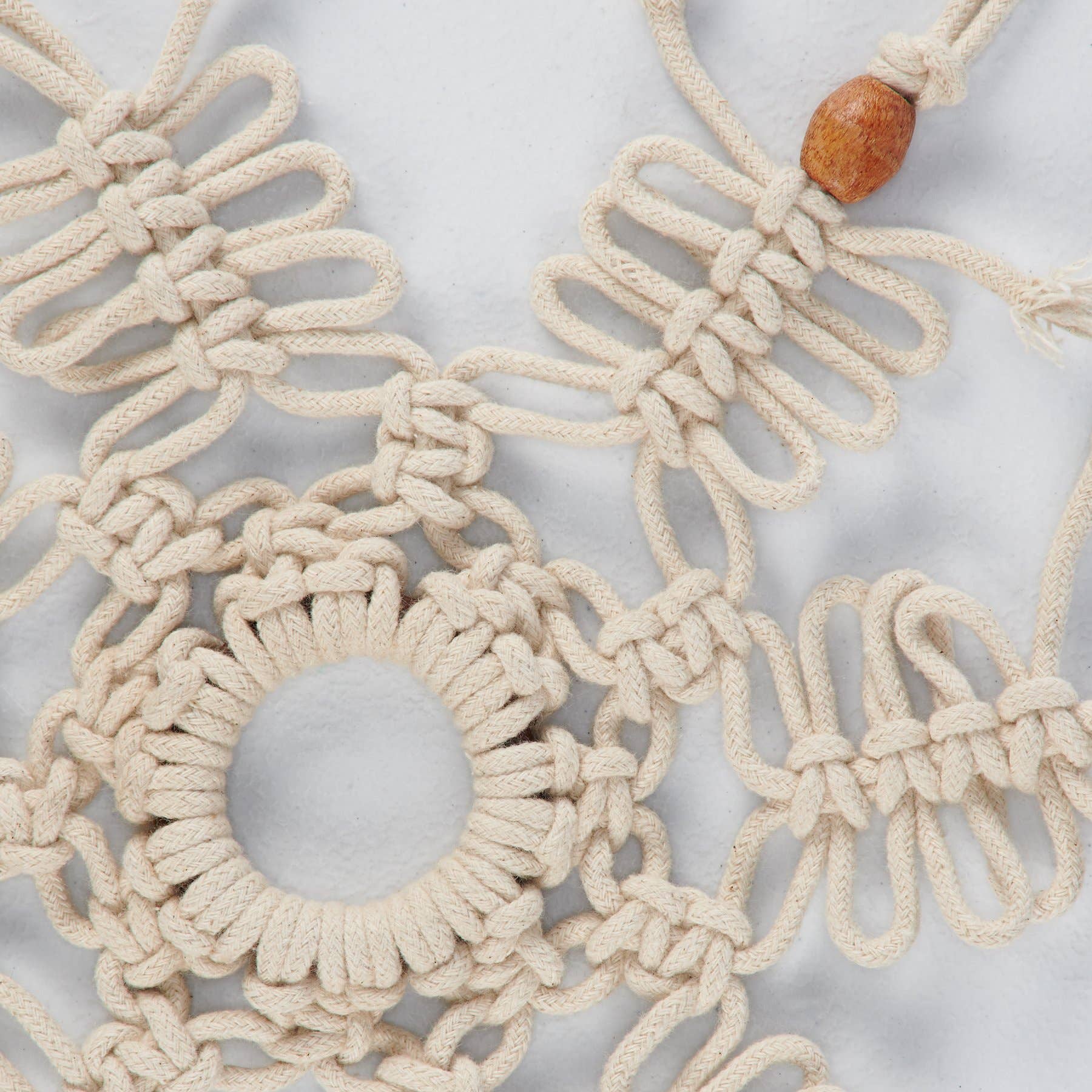 A decorative ornament from our Christmas Collection featuring a snowflake design made in a macrame style. Our Macrame Snowflake ornament is easy to hang via cotton loop hanger separated by a wood bead. A neutral seasonal home accent.