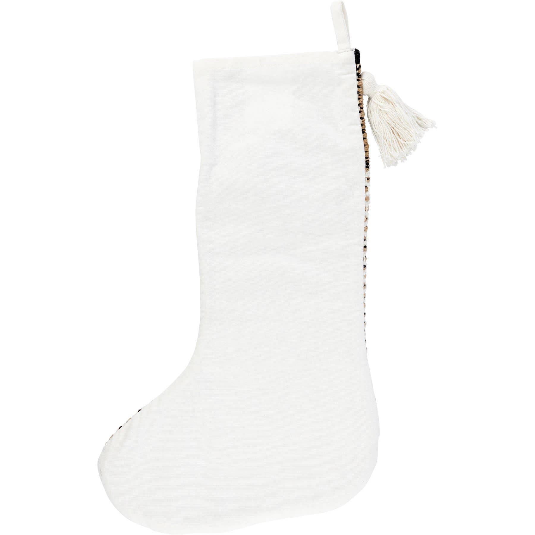 A cotton stocking from our Christmas Collection displaying a natural color palette with woven jute and thread patterns and white tassels along cuff. Our Neutral Tassels stocking includes a loop for easy hanging. A neutral seasonal home accent.