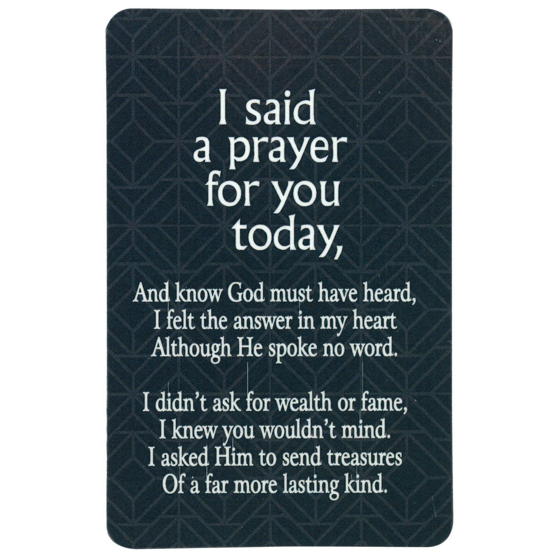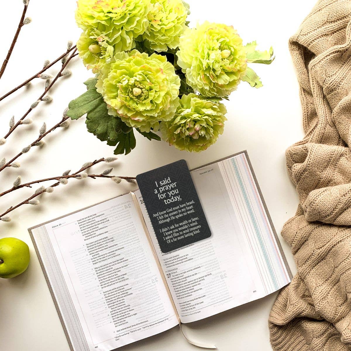 Pocketcard style bookmark is a wonderful small gift to remind someone that he is in your prayers. Features the poem I Said a Prayer For You Today, over the front and back sides; background is a gray geometric design on black. Also on back are To and From spaces for writing in names. The card stock is clear laminated for extra durability. Size of bookmark is 2 1/2" x 3 7/8".