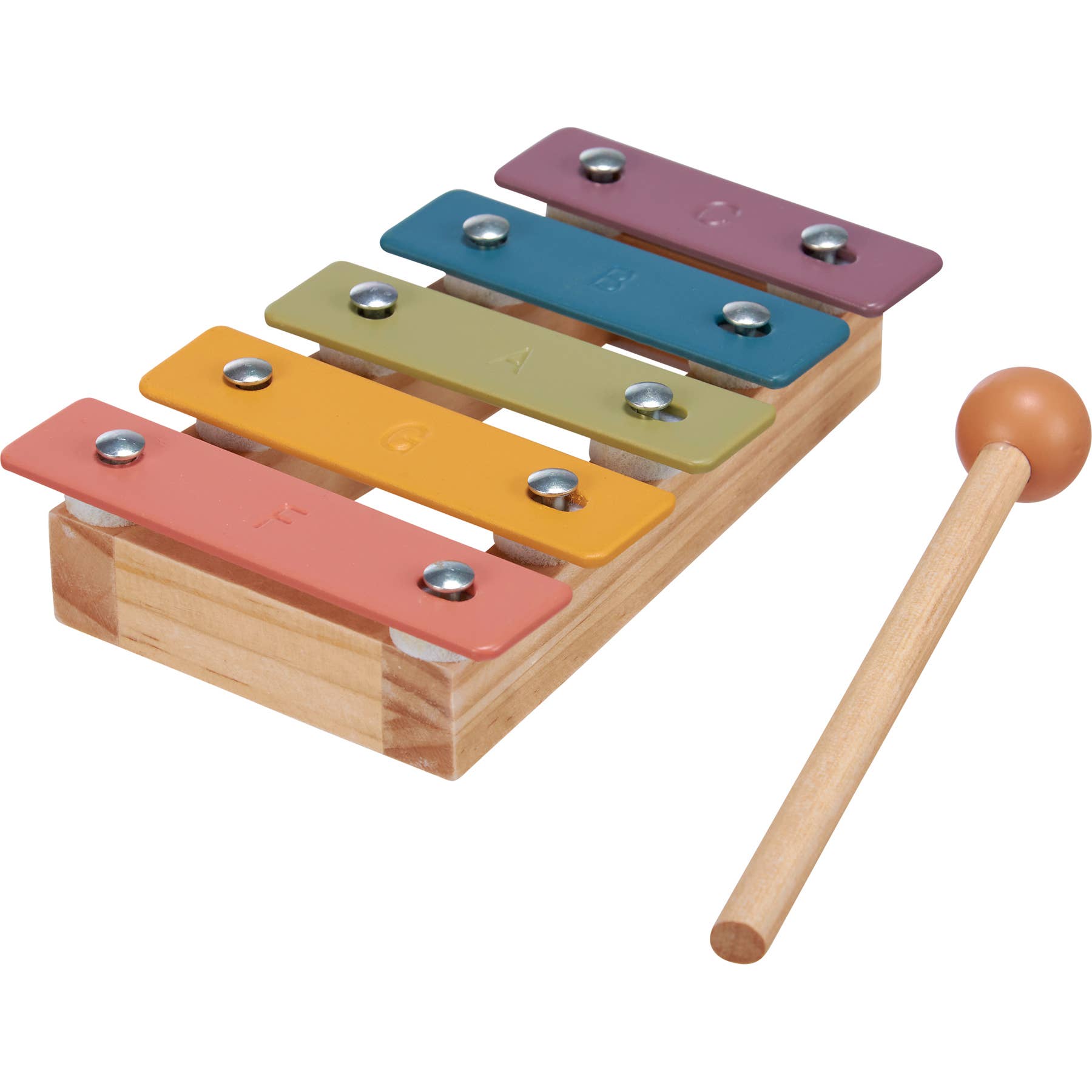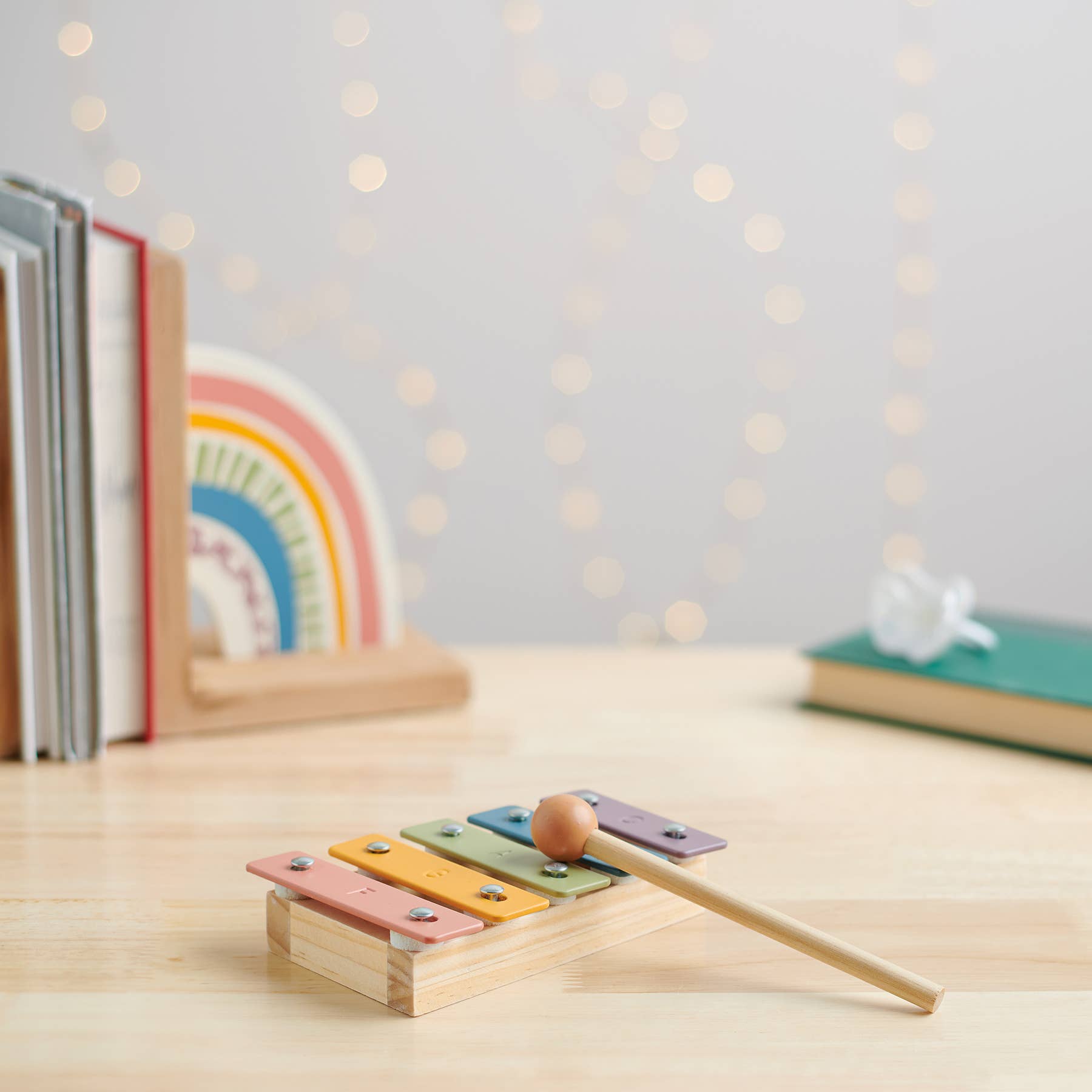 A fun wood and metal xylophone for toddlers with a charming rainbow design to each note bar. Xylophone includes five different notes and wooden mallet. Another adorable addition to our exclusive Happy + Bright Collection. Packaged in shrink wrap. Our rainbow xylophone is recommended for ages 18 months and older.