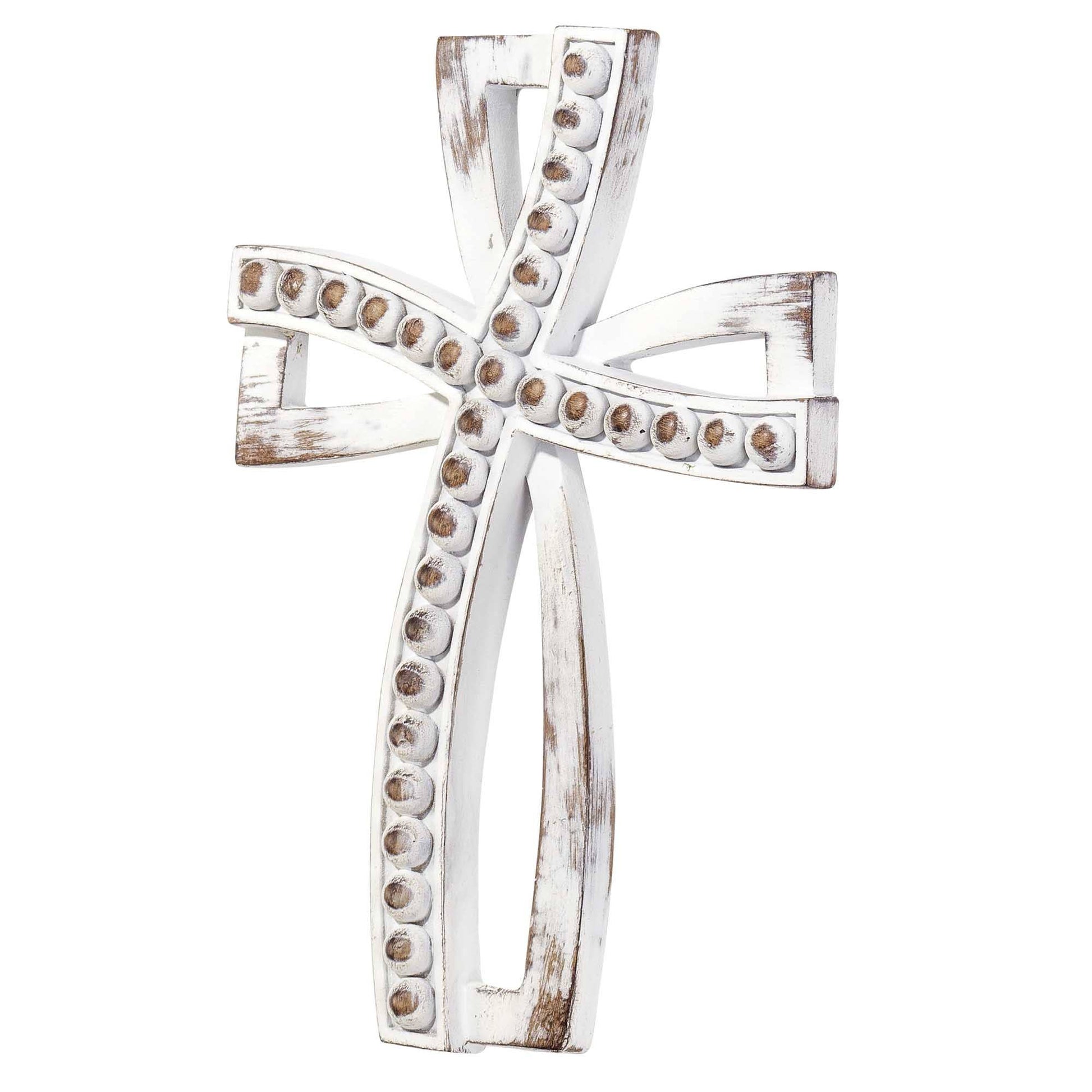 Rustic style wall cross has the look of two crosses in one. It is an open flare shaped cross; and if you look at just the part with the raised rivet look, you'll see a leaning curved cross. Attractive whitewash finish leaves centers of rivets as a wood tone for contrast. Cross is resin and 10" high.