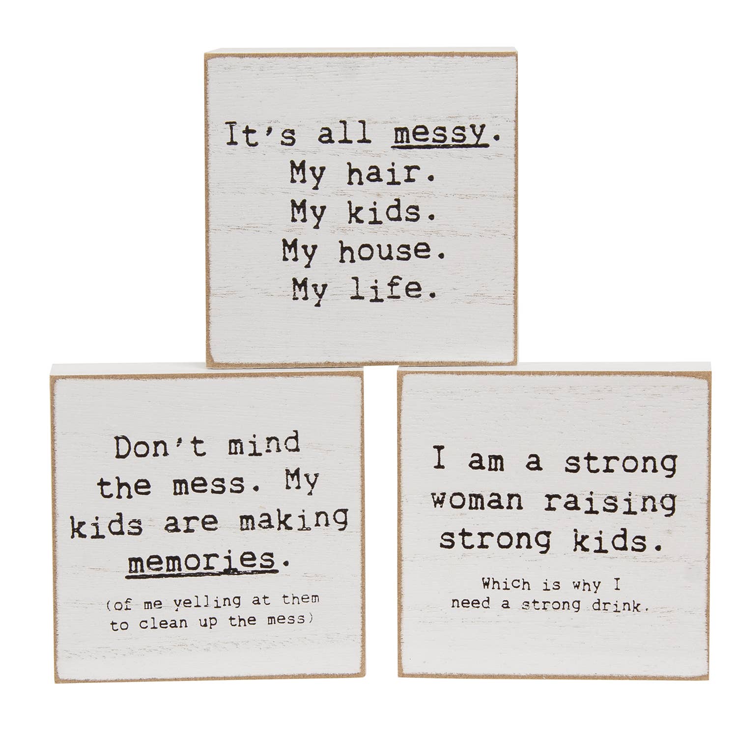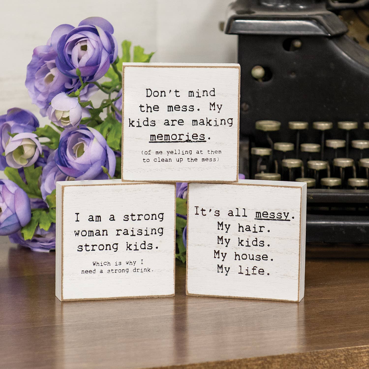 Don't stress over the mess! Make simple but lovely farmhouse displays with the funny Strong Woman Strong Kids Mini Square Block assortment. This 3" square blocks have a white wood print background with distressed edges and playful sayings in simple black text. They are .75" thick for easy freestanding display. One block reads 'I am a strong woman raising strong kids.