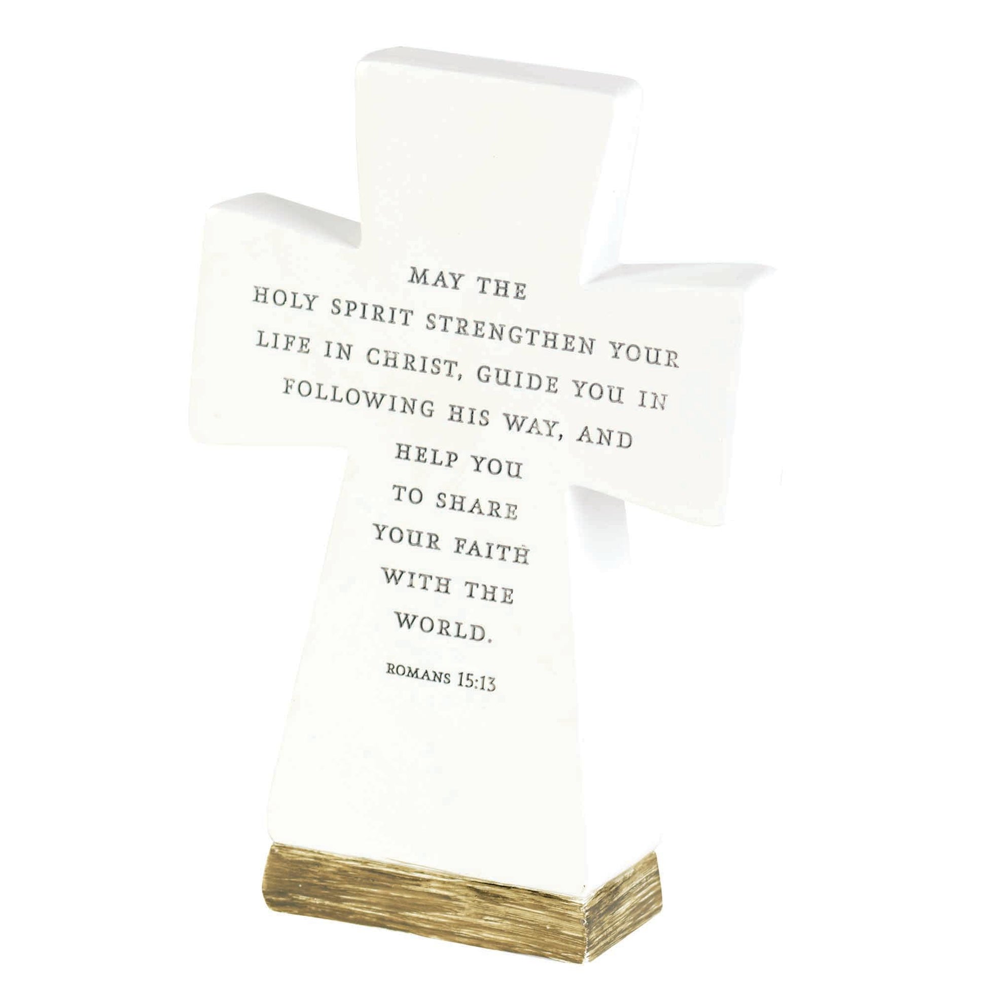 Tabletop Cross Is Engraved On One Side With: My First Communion And A Chalice. The Back Side Features The Text: May The Holy Spirit Strengthen Your Life In Christ, Guide You In Following His Way, And Help You To Share Your Faith With The World. Romans 15:13. Height Of Cross Is 6in; Made Of Resin And Features A White Finish On A Woodgrain Base.