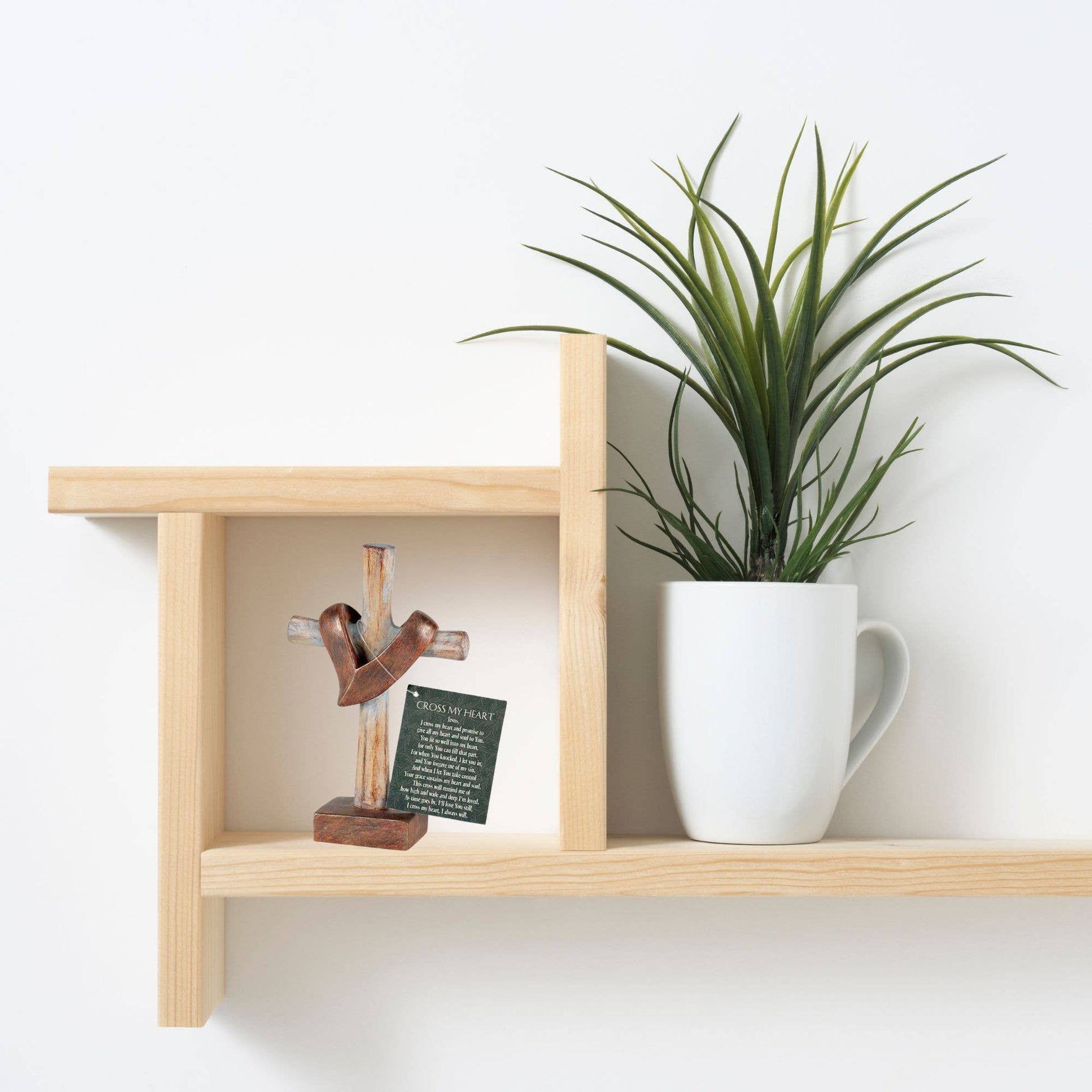 Petite tabletop cross, with unique heart drape, has the look of gently whitewashed wood. Comes with a tag that has the poem cross my heart. Makes an ideal Christian gift for many occasions. Cross is just under 6" high, is 3 1/2" wide and 1 3/8" deep at base. Made of resin. Text of poem: Jesus, I cross my heart and promise to give all my heart and soul to you. You fit so well into my heart, for only You can fill that part. For when you knocked, I let you in, and you forgave me of my sin. And when I let You take control Your grace sustains my heart and soul. This cross will remind me of how high and deep and wide I'm loved. As time goes by, I'll love you still, I cross my heart, I always will. (Poem by Alda Maria copyright Dicksons)