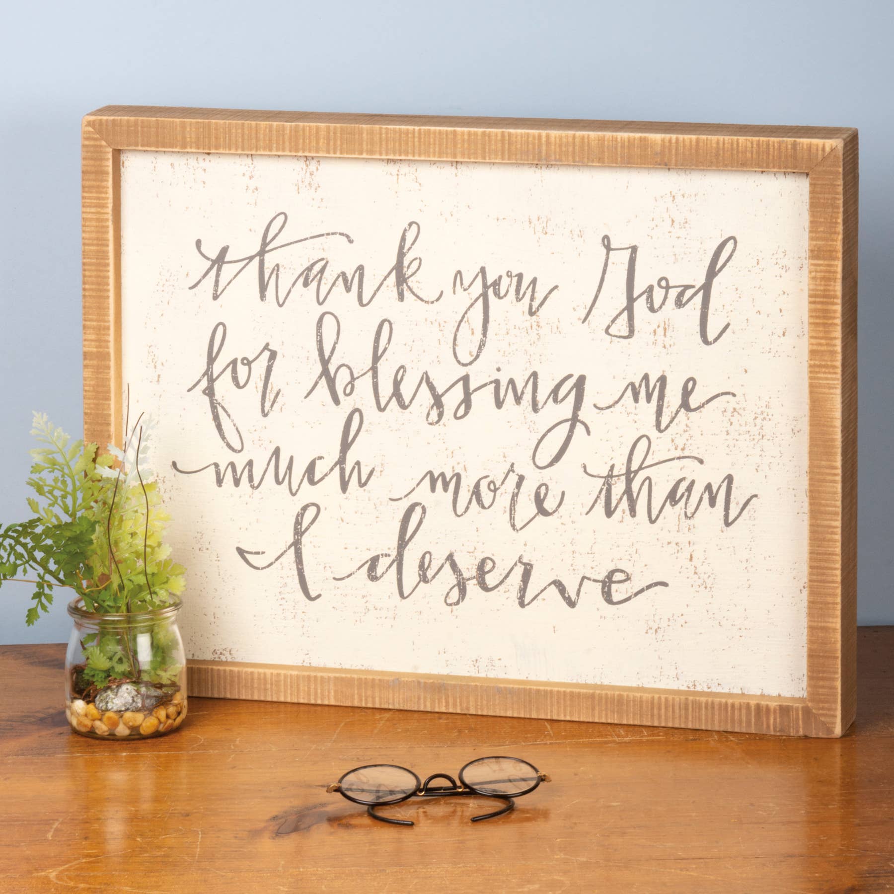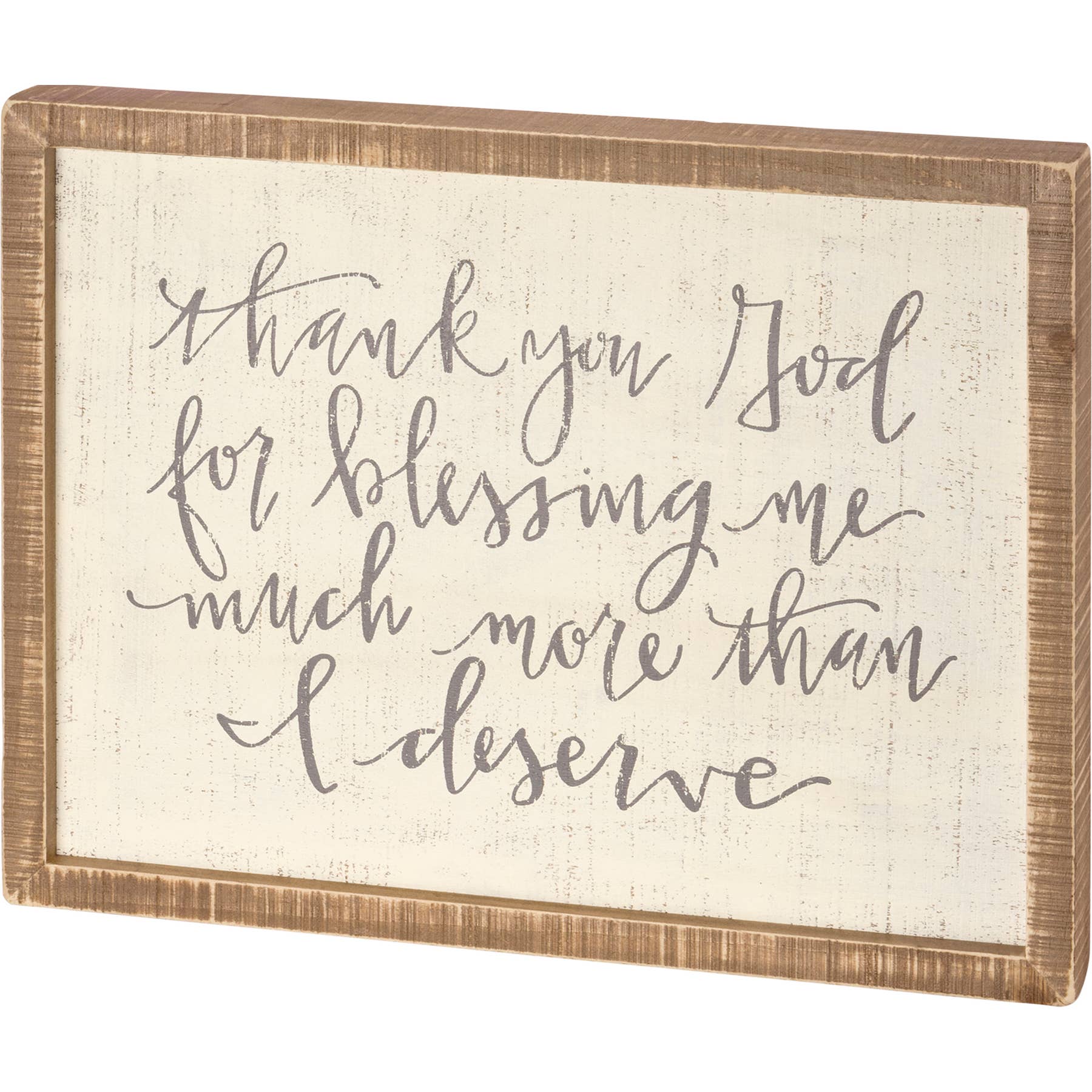 A wooden box sign lending an inset "Thank You God For Blessing Me Much More Than I Deserve" hand lettered sentiment. Easy to hang or can free-stand alone on a shelf or mantel. Complements well with coordinating design pieces for a thoughtful gift set.