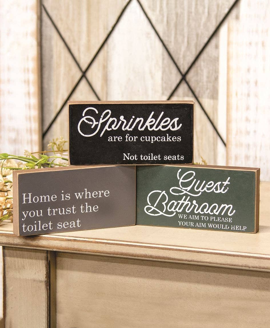 Trust the Toilet Seat Block sells as an assortment of three designs. Block has unfinished sides and distressed edges and it comes with two pre-drilled keyhole slots for hanging display. It reads, "home is where you trust the toilet seat" in white text over a gray print; "sprinkles are for cupcakes not toilet seats" in white text over a black print; or, "guest bathroom - we aim to please your aim would help" in white text over a green print. Measures 3" high by 5.75" wide by .75" deep. Please note: This item features an assortment of designs which are priced and sold individually (not as a set).