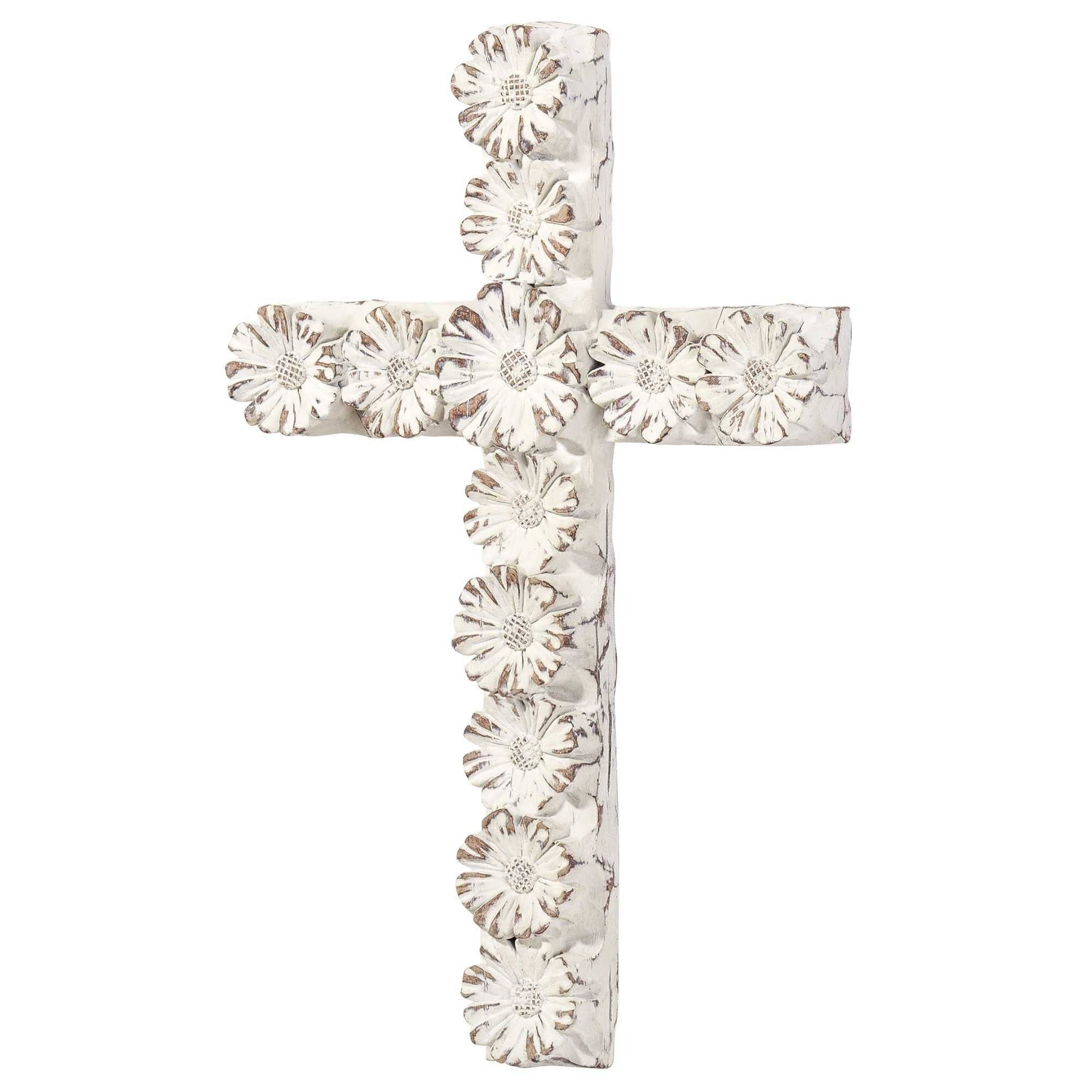 Realistically sculpted flowers stand out from the back of cross for a richly dimensional look. Background has a chiseled texture. Whitewash finish is nicely done. This resin wall cross is 10" high.