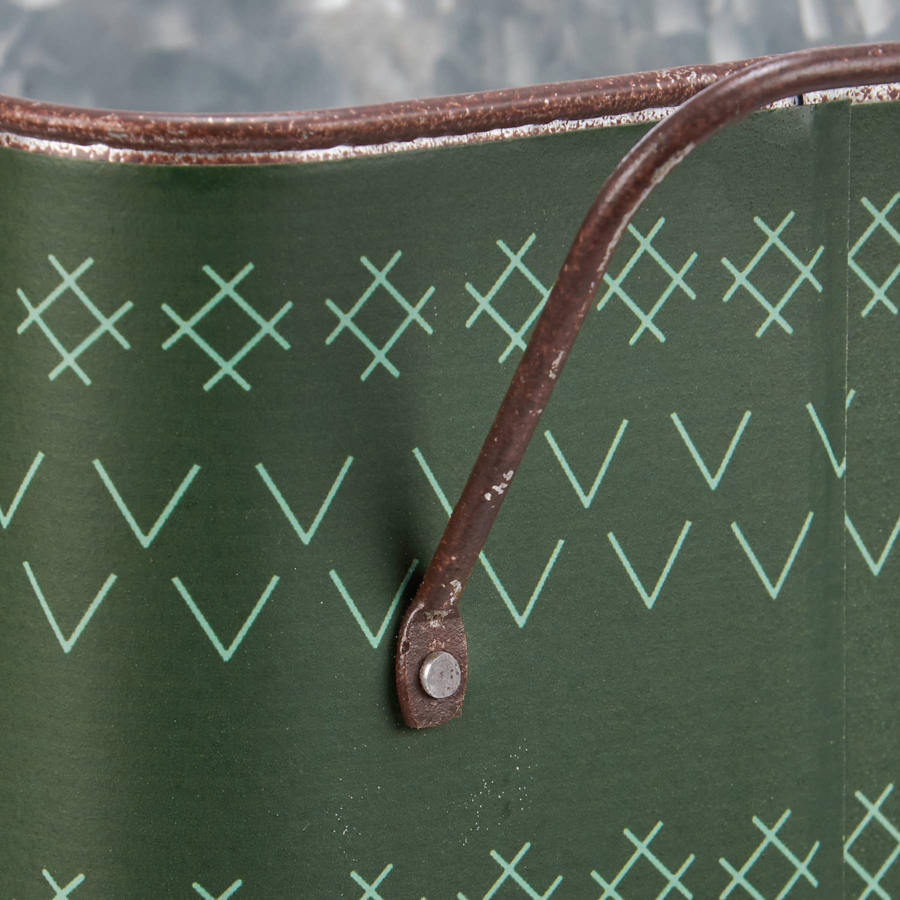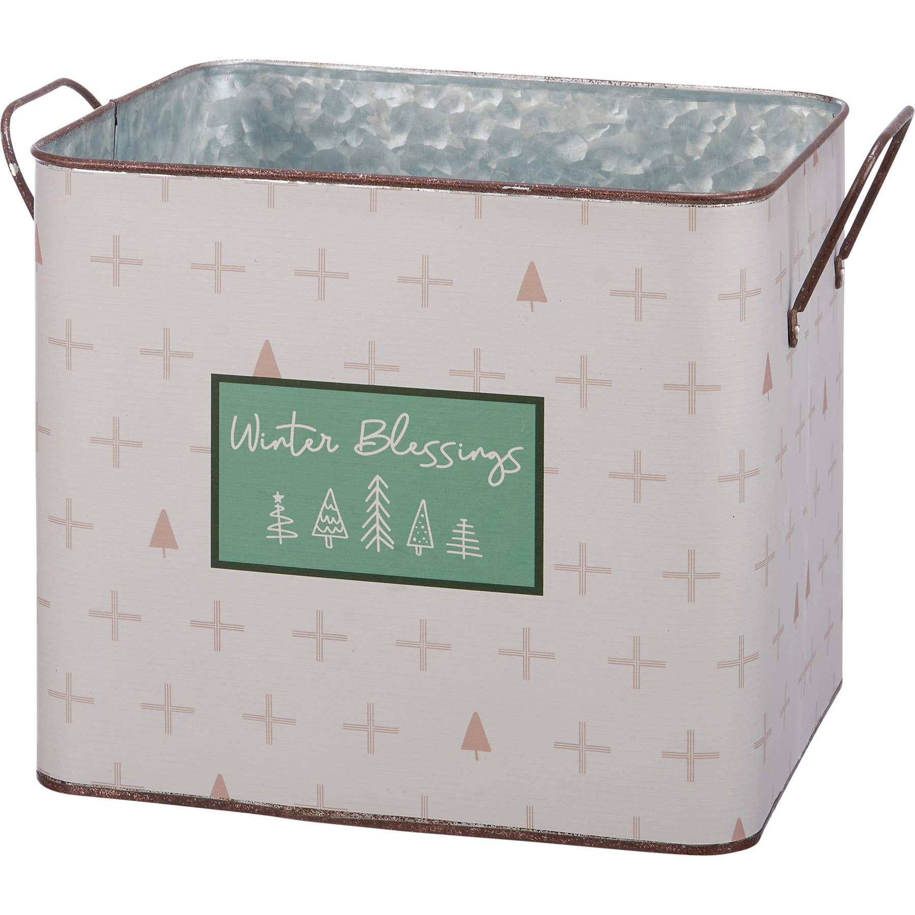 A set of two bohemian-inspired metal bins from our Christmas Collection featuring unique double-sided designs on each. Large bin displays "Winter Blessings" sentiment with small bin displaying "Merry Everything & Happy Always" sentiment. The Winter Blessing bin set includes dual side metal handles for easy carrying and stack inside each other for storage.