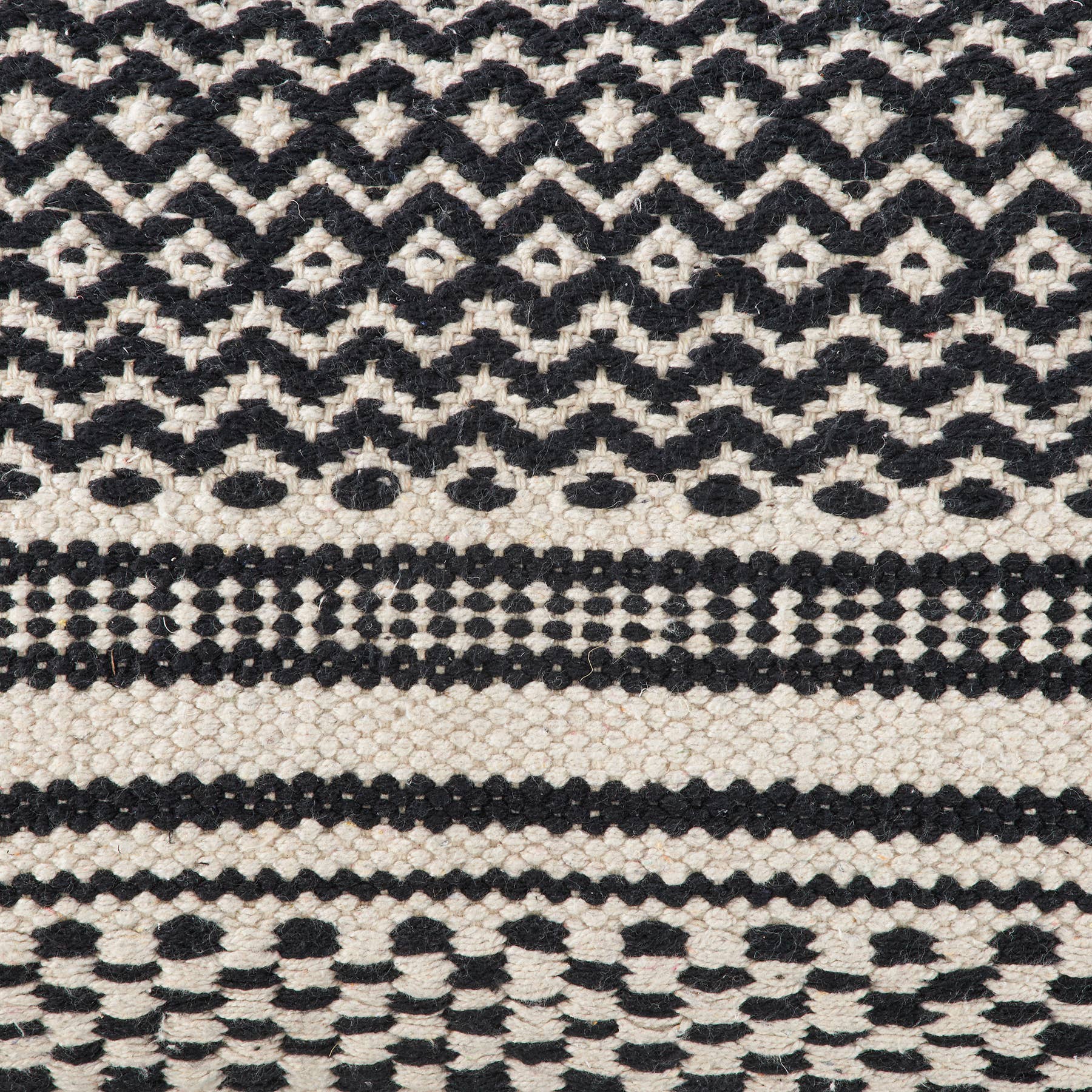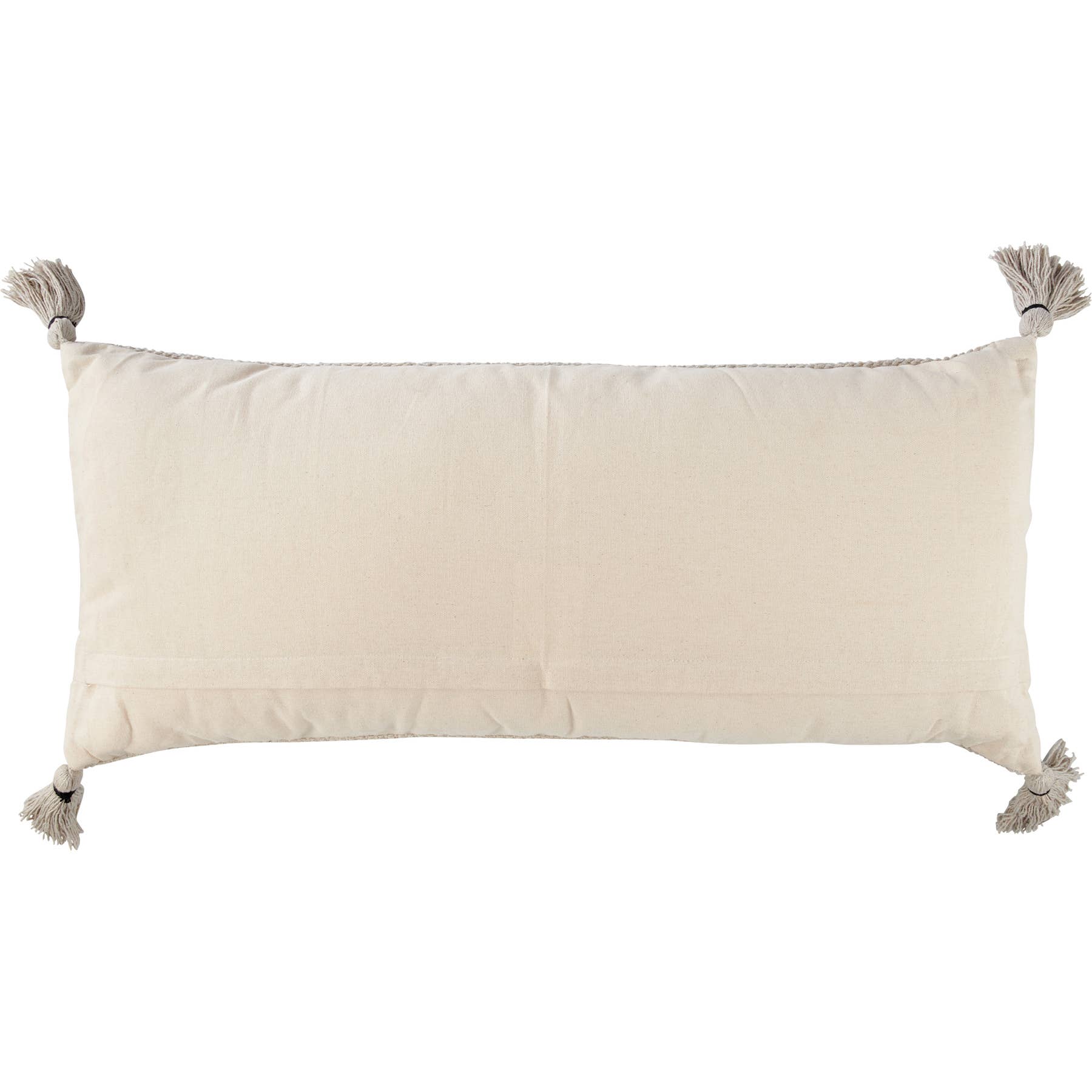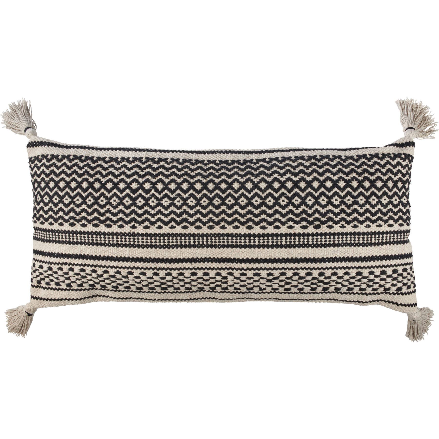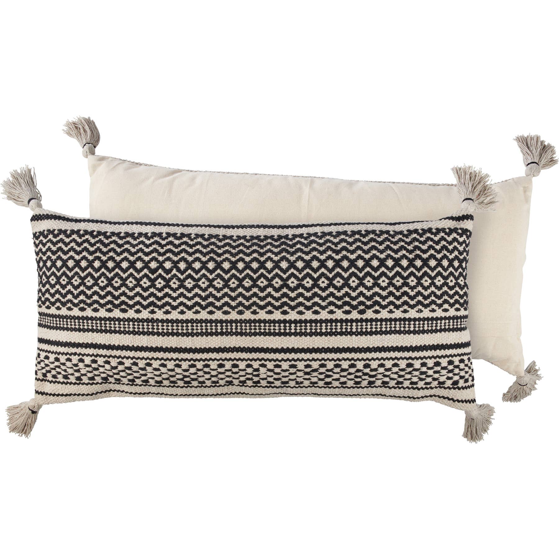 A decorative cream cotton pillow from our Bohemian Collection displaying various black geometric patterns woven throughout for a freeform style. Pillow features tassels on each corner and a zipper to easily remove and clean cover. Our Zigzag Bolster pillow contains polyester filling and is shipped vacuum-sealed for protection and storage. A neutral everyday home accent that coordinates with a variety of styles.